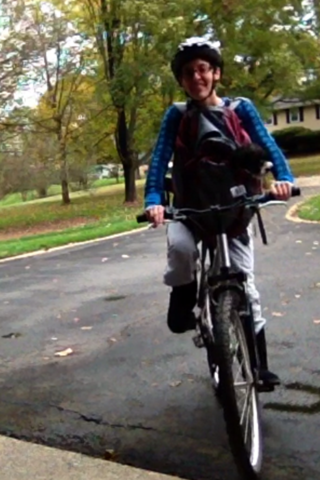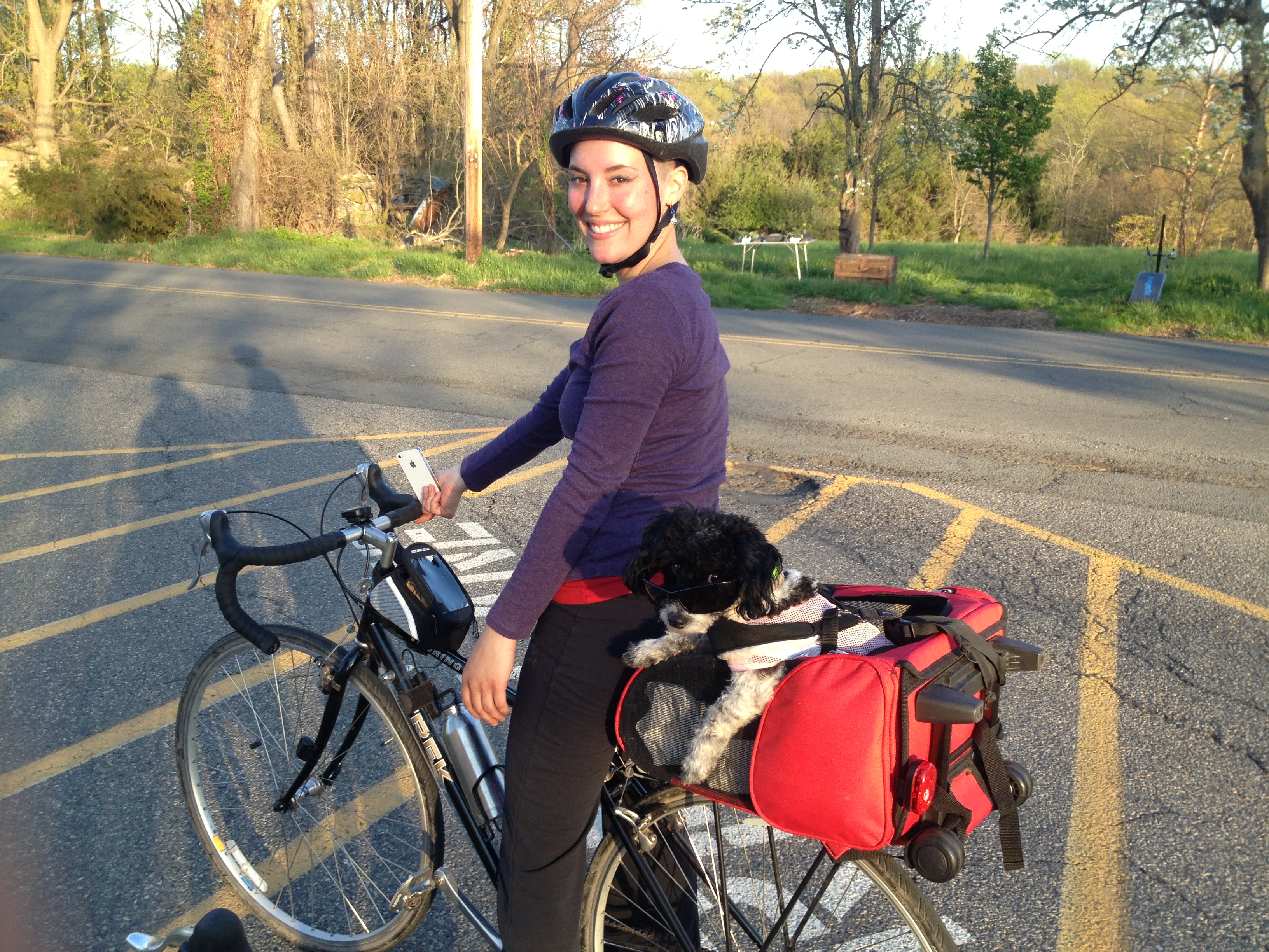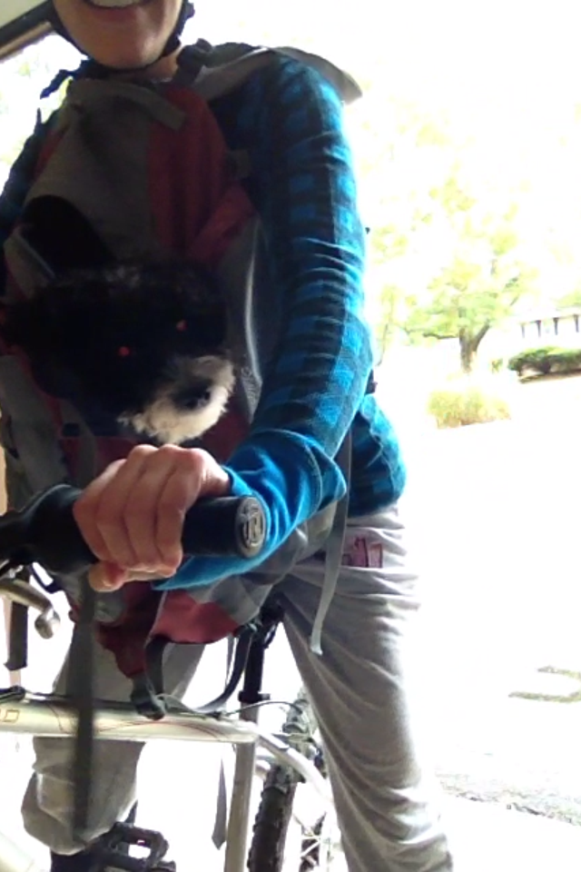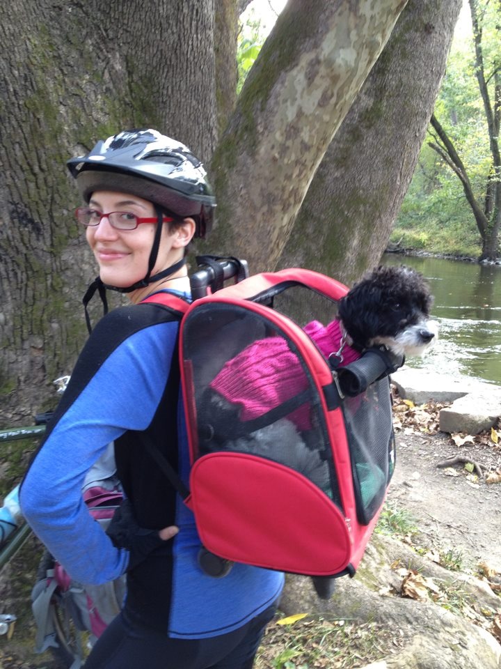 When I was really small, I moved to New Jersey with my human. There was a lovely little biking and running path that runs along the Delaware River, and in an attempt to bring me along on her bike rides, my human tried teaching me to sit in a front basket. It was way too scary and I jumped out on the first attempt.  Cautiously but undeterred, the human tried a front-loaded backpack.