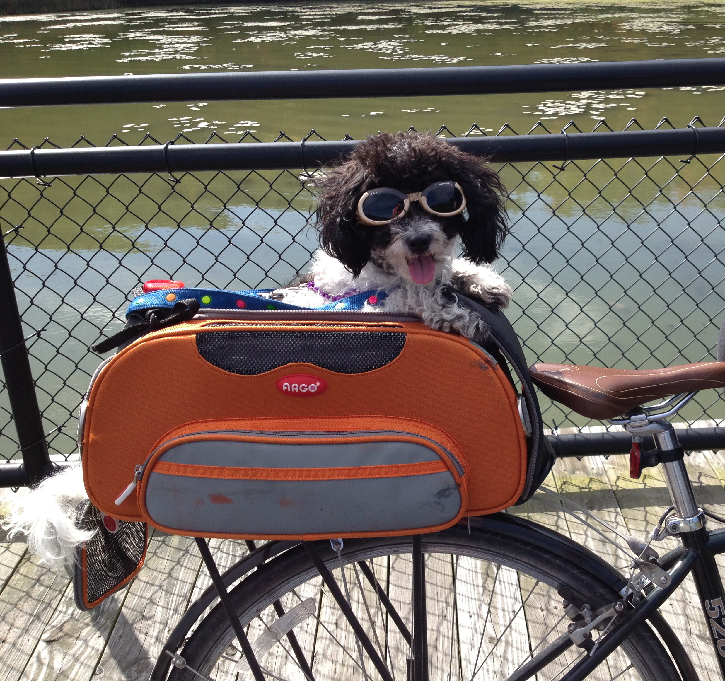 After realizing that too many miles with a growing pup was a bit tough on her back, the carrier was safely secured to the bicycle’s rear rack. Stylin in my red convertible.