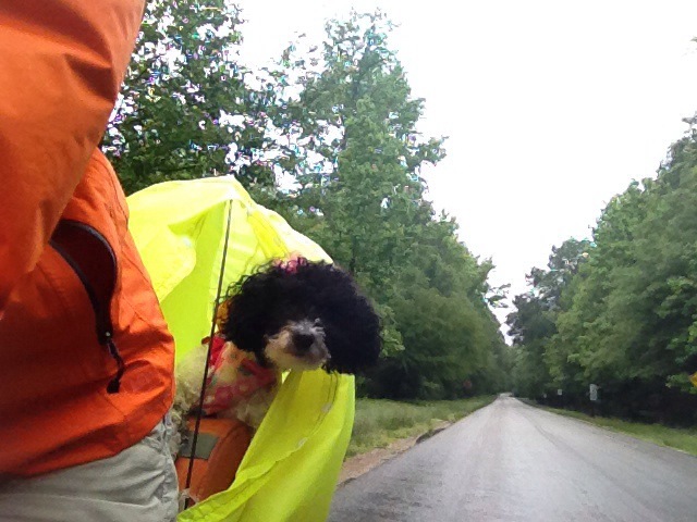 It rained lightly most of the day today, so Petunia’s rain fly was covering her carrier to keep her dry, but she likes to stick her head out and check out the sights and smells, even if she gets a little wet. We had a pleasant ride to Fredericksburg and enjoyed walking around the city a bit and surveying the many dining options. His propensity to try to scavenge anything off my plate that I don’t immediately inhale has earned Greg the nickname “Are You Gonna Eat That?”