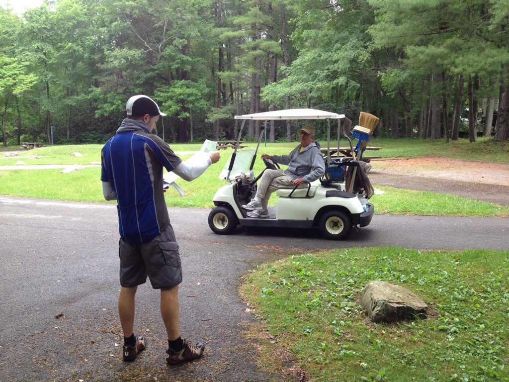 As we prepared to settle in for the night, we met our first fellow bike tourist, Steve, from Minnesota. He was headed eastbound and had faced rain almost every day of his trip. Soon after Steve went off to his campsite, a golf cart puttered over to us and we were greeted by its driver, Jim, the volunteer campground overseer.
