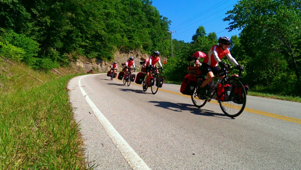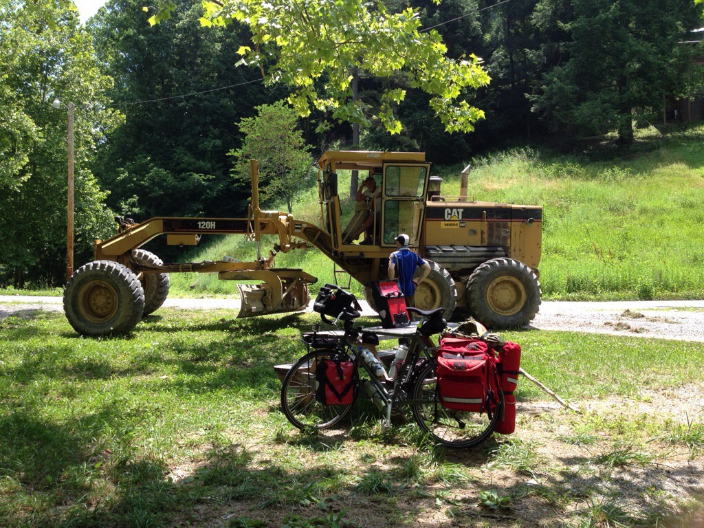 Kentucky has not been a highlight of this trip so far. We’d been warned about the big dogs off leash who bark and chase cyclists down the streets (and up hills, in some cases). We even met a cyclist whose panniers had been ripped open by an aggressive dog. After experiencing it first hand, it’s as bad or worse than we’ve heard, it seems, with our hearts pounding after each close call and quick escape from the K9s, which we fend off with a close-range blast from Greg’s very loud air horn. It’s been an effective and non-violent way to deal with them, but we’ve heard of the sometimes tragic consequences for the dogs who run into the busy, winding roads full of pedal-to-the-metal pickup drivers. Petunia gets anxious when she hears the angry barking of the dogs before we see them, never sure whether they’ll be chained up and sadly running the same 10-foot route over and over until it’s a worn sand pit, or running at us full speed, baring its teeth at our hyper-spinning legs.
