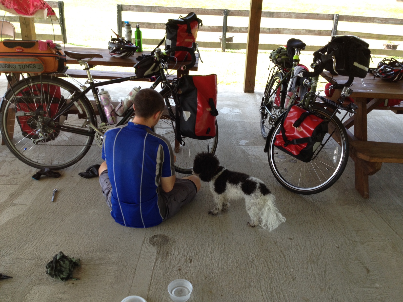 I don’t bring it up to scare anyone about our safety or discourage anyone from bike touring, but it’s worth discussing some of the danger involved with modern cycling. We have tried to manage much of the risk by takibg precautions such as wearing rearview mirrors on our glasses so we can see whether approaching cars are giving us space or if we should pull off the road altogether for oncoming coal or logging trucks. We have high visibility triangles, bright colored panniers and jerseys, rear and front blinking lights, and a super loud air horn (dog deterrent and alarm). We ride defensively and try to pull off into a driveway or away from the road if we need to stop for anything. We also have bike bells and use a simple code system: one ring is to call attention to something, two rings means a car is approaching, and four rings means we need to stop. We try not to ride when visibility is poor and alert each other in case of road debris or dogs. Still, accidents happen, and we were saddened to hear about the tragic loss of the young woman.