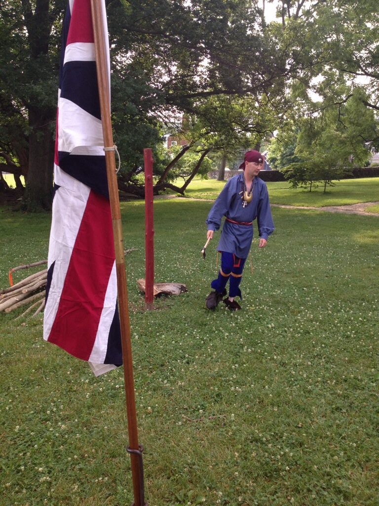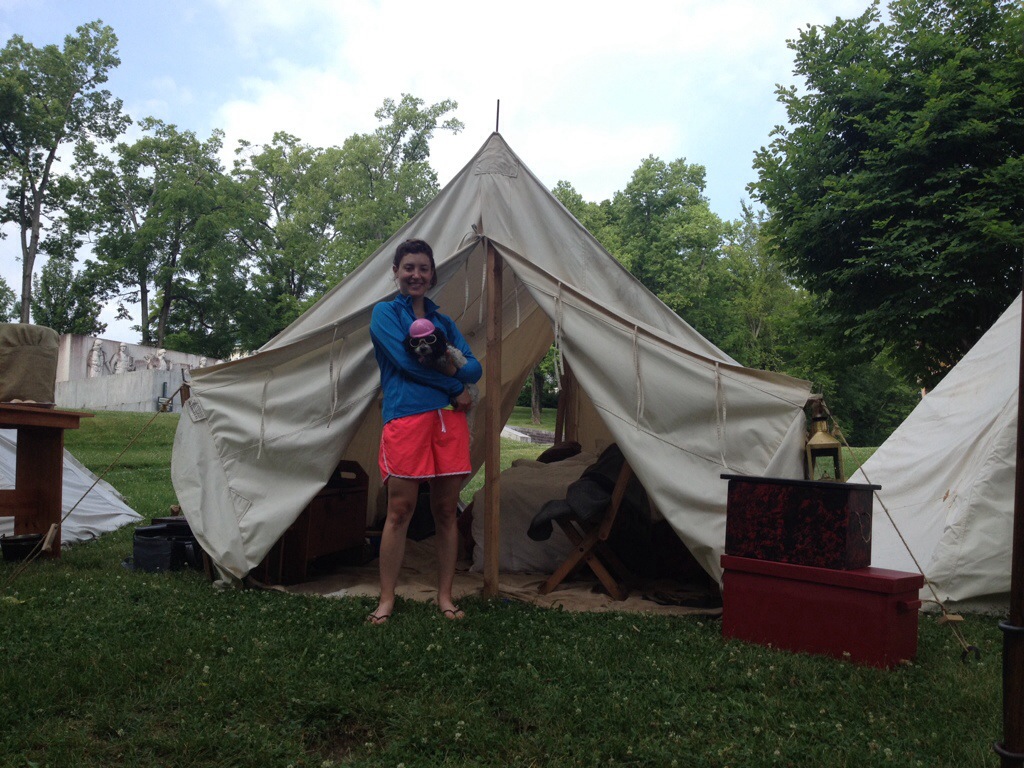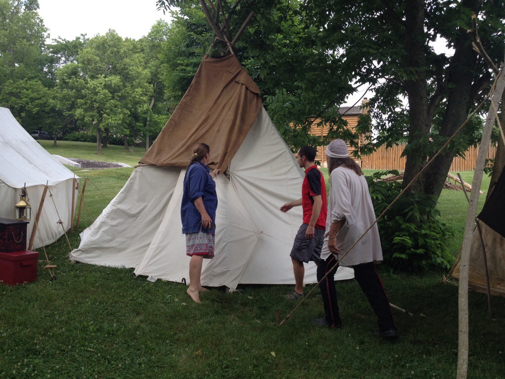 Last Friday, we rolled into Harrodsburg around dinner time and spoke to a local fellow who suggested camping in the state park at Old Fort Harrod nearby. We pulled in at dark to see that some large tents were already set up– but they were made of canvas and set up in a British military style, and a couple of men in costumes were sitting around and stoking a small fire. We were welcomed and told that they were there in preparation for the coming weekend’s large reenactment of the Native American raid on Fort Harrod settlers that occurred in 1777. The next morning, we got a tour of the tents and teepees by some really cool costumed volunteer actors/actresses and educators. They told us that the previous night that, from the outside, our green tent with our green headlight shining from within made us look like E.T. among the old fashioned settlement.