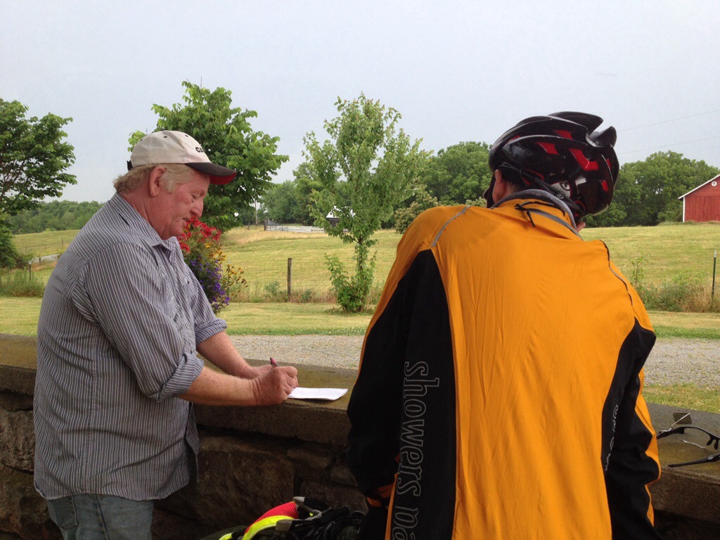 Through another gorgeous area of thinly populated farmland, we saw some heavy clouds headed our way. A man passing us in a pickup truck with a big dog in the truck bed slowed enough to call to us “Big storm coming– follow me if you want to avoid that rain.” A few hundred yards ahead, he pointed out the window to a house with a porch and said “I know them- go ahead and take cover and I’ll give them a heads up. Gotta go, much to be done.” Heeding his advice, we pulled under the car port and sure enough, the skies opened up as we remained dry and comfortably sheltered. The elderly homeowner came out with bottled water for us and eventually the truck driver came back briefly to chat about our travels and route.