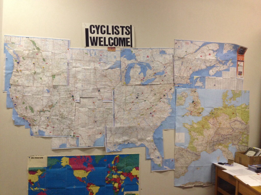 It finally started to rain as we got close to Sebree, KY. At about 5 PM, we pulled up to a church that was listed as a cyclists-only hostel in town, and called the number listed on the door. A woman named Violet picked up the phone and told us she’d be right over from the house next door to the church, and she appeared right away and took us to the church basement. This place was absolutely immaculate- it served as a sort of community center, storm shelter, and also a perfect haven for bicycle tourists. It had a shower, real towels, a huge map for cyclists to pin their home town, big comfy couches, mattresses to sleep on, a full kitchen, wifi, free laundry, and even some snacks in the fridge. Violet told us to cast off our wet clothes, enjoy a warm shower, and get ready to come over for a home made dinner in an hour.