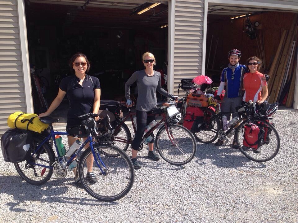 The next day was a planned low-mileage day to give our sore seats some rest. After carefully going through a dirt and rubble road that was closed to cars (but not to cyclists who had been previously tipped off by east bound cyclists), we pulled over for a water break. Moments later, a tall man on a blue tractor pulled up and introduced himself as Rick, a local and a fellow cyclist. He kindly offered to let us stay the night at his place near the city of Carbondale. It was still early, so we followed his tractor a mile down the road to his beautiful home on a lake that we later learned he engineered. We met his wife Suzanne and one of their daughters, Sarah. They let us unload our gear, shower and watched after Petunia while we ventured out sans-panniers to get Thai food for dinner. We’d exchanged phone numbers with Katie and Karensa, so we communicated, and realizing that they were in the area, we all converged on the restaurant for curries. Rick and Suzanne generously extended their hospitality to our new friends, so we all pedaled back in the dark and slept peacefully indoors on the pull out couch and beds they’d made up for us.