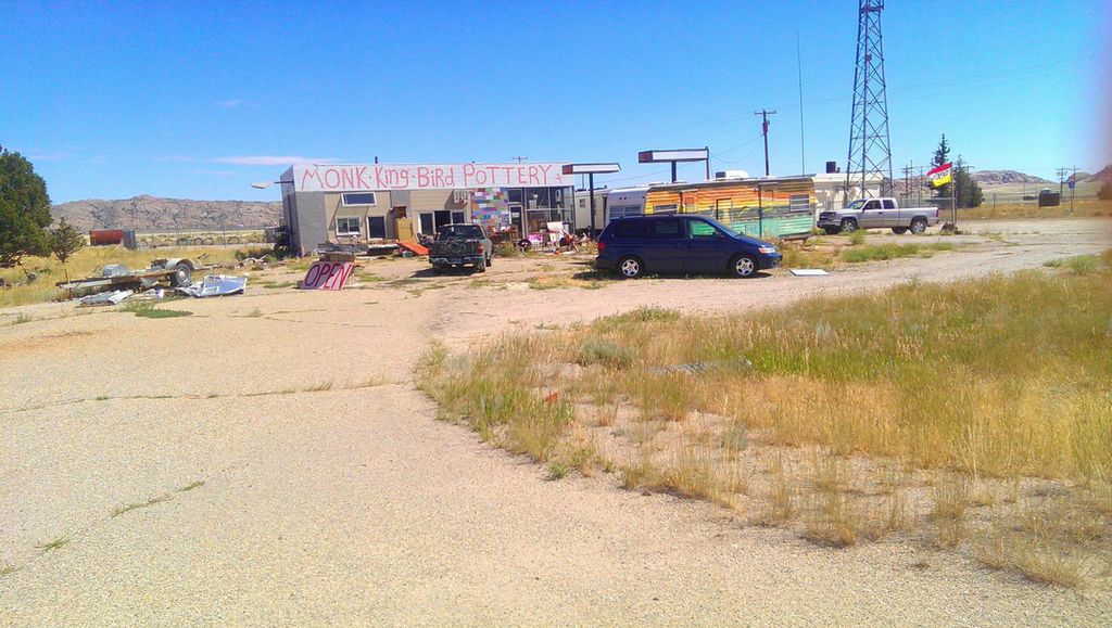 Across the street was a wild-looking building with a storefront littered with old cars, RVs, and heaps of twisted metal and junk. Hand-lettered across the facade were the words “MONK King BiRd POTTERY,” a slightly mystifying name made even more intriguing by its owner, Byron, a congenial thirty-something artist in a brown felt hat with bloodshot eyes. He shuffled over to kindly introduce himself and invited us to camp there, even offering to let us stay in one of his permanently-anchored RVs.