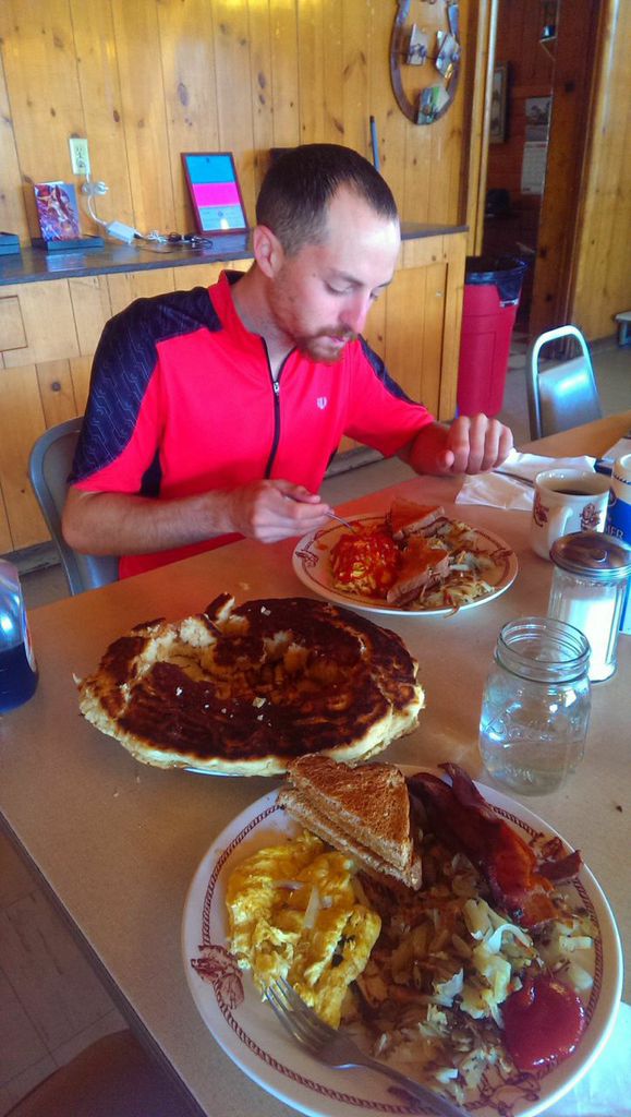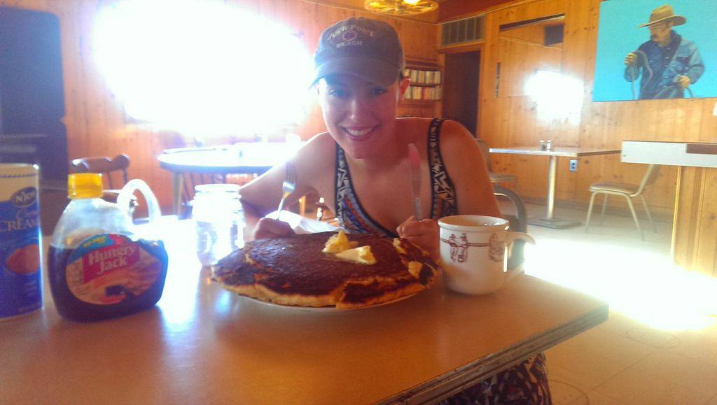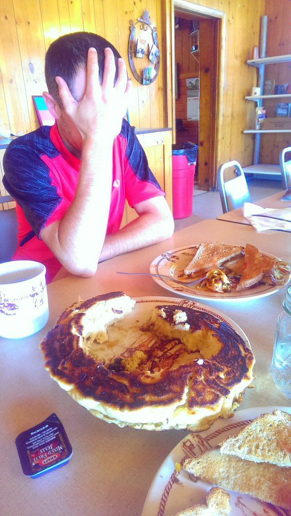 The next morning, with the dust from the previous evening’s commotion settled, we had breakfast at the bar with food, deciding on platters of eggs and toast, plus one of their pancakes. The breakfast cook asked if we were really sure that we wanted to order the Dude Pancake. “It’s about 15″ across and 3″ deep and it takes three men about all day to eat it.” Challenge accepted.