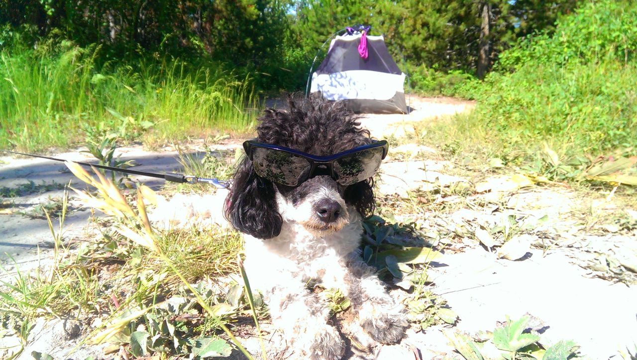 We encountered another grouchy park ranger, who stopped us on the path to inform us that dogs were not allowed on the bike lane. We pointed out that Petunia was in her carrier and not setting foot (setting paws?) on the ground, but he pushed back, citing a “study that was done that concluded dogs on the bike path caused an environmental impact,” and that we would have to ride on the narrow shoulder of the main road, just 15 feet away from the bike path. Baffled, we suggested we’d cover her up with her rainfly to prevent her from being seen by any wildlife, but that wasn’t good enough for this cranky man, who insisted again that we ride on the busy road full of tourists in rented RV’s who were staring at the scenery and possibly jeopardizing our safety. When we pointed out that the bike path was in fact dedicated to a 13 year old girl who was struck and killed by a car while riding her bike on this main road, he was unmoved Finally, after more discussion, he let us go on with a warning that another ranger may stop us farther on… which didn’t happen. As we safely continued on our journey, we got silly dscussing all of the local environmental impacts more pressing than my tiny, quiet dog, securely stashed in her carrier…. the huge planes landing in the field nearby, or the tons of cars and RVs blowing by all day, and… wait a minute, isn’t Wyoming the home state of Dick Cheney, and Haliburton has a huge facility there? But I digress.