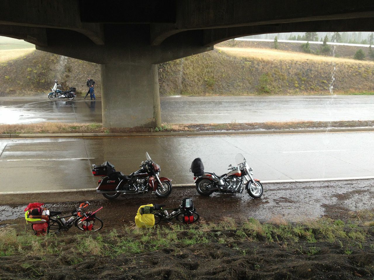 We didn’t see much other wildlife, but the bison was pretty neat. Just before we got to Old Faithful, it started to pour rain, but luckily, we were near the first bridge we’d seen all day. So we ducked under it along with a few motorcyclists to wait out the storm.