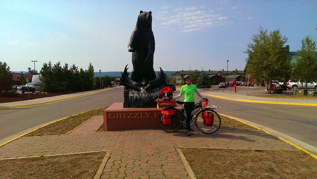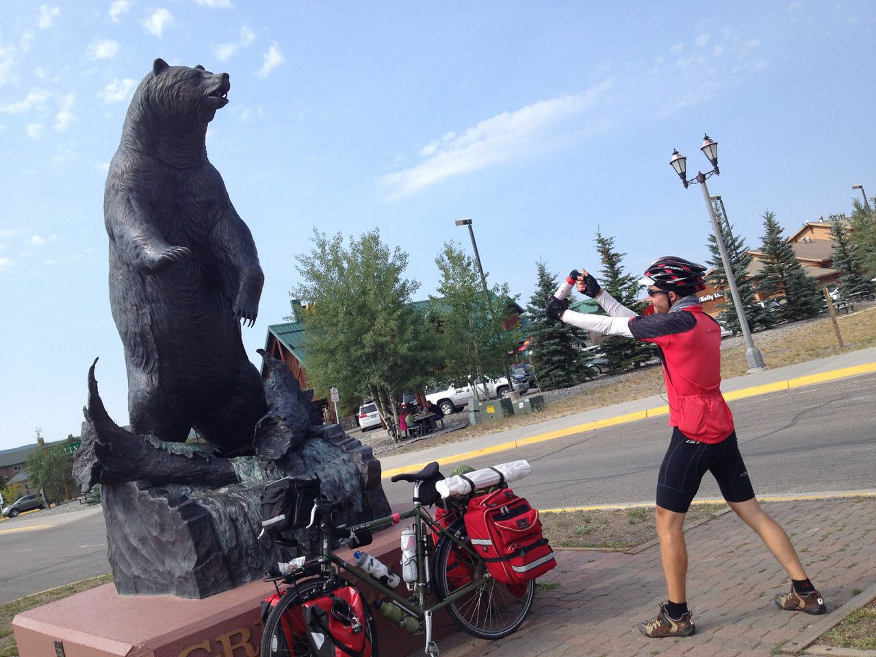 Greg had been prepared for a possibly grizzly encounter, with a certain amount of “bearanoia” that had him carrying the bear mace around constantly, even setting it on the nightstand of a cabin we stayed in back in Virginia. He finally got a chance to safely practice his defensive moves… against this statue in West Yellowstone.