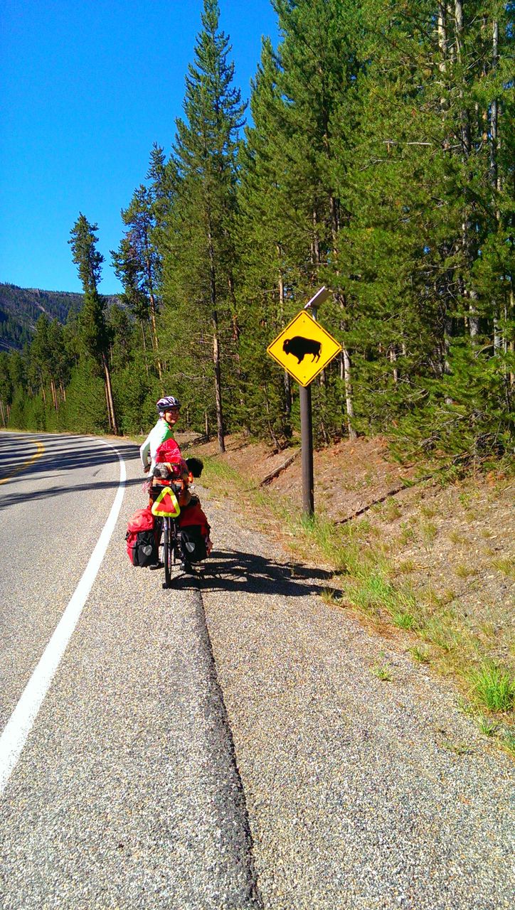 There was a slight traffic jam due to a bison who was having a drink from the river running alongside the road, and we rode alongside a rubbernecking minivan to stay out of its way. This unusual road sign was quite germane: