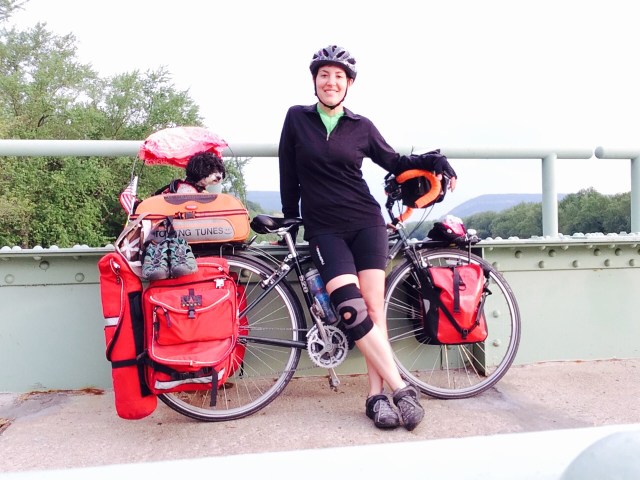 By the standards of the Adventure Cycling Association routes, Port Jervis was a rather large city to encounter, with a population of nearly 9,000. I dodged the cars, had a bite to eat and Petunia got some more goodies (bacon with ice cream). I was even able to charge my phone and spare battery a bit while keeping an eye on Tunes, who was outside in her shaded carrier, leaning up against the window where I sat. A few people asked me the usual questions about where I was going… and although my time-challeged goal destination is Seattle, and had told another couple as much this morning, by 4 PM I’d started feeling that this was too overzealous. I’ve already got one nearly 5,000 mile cross-country bicycle tour under my belt, so why jinx it with such lofty declarations? I’m pretty sure I can solo ride to Maine, which is where the route hooks up with the westbound Northern Tier that rides to Washington. It would be great to then go west towards Niagara Falls, and even the Twin Cities, or possibly Glacier National Park if I had time and limbs left. But there I was, backpedaling on day 2, and telling a little girl that I was riding to Bar Harbor, even though she did not know where Maine was at all.