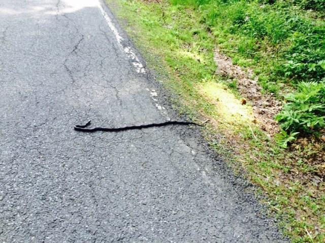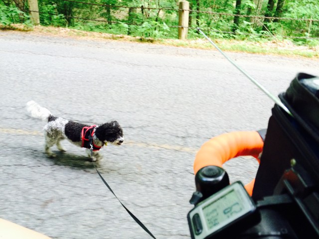 After crossing the river back into NJ, we rode a very quiet, nearly automobile-free 17 mile stretch paralleling a bit of the Appalachian Trail, peacefully avoiding the Memorial Day traffic. Unhurriedly, I let my lungs fill with the sweet sylvan smells, enjoying the shade of the trees and the beauty of the ferns. I heard two hog-like grunts from my passenger, which meant it was time for Petunia to get her exercise, and so she ran alongside me for a couple of miles. She started out at a good clip of 11 MPH, then going up the hills and towards the end of her second mile, we slowed to around 6. She drank a lot of water, walked over to me and I set her back in her carrier and buckled her up. Good dog.