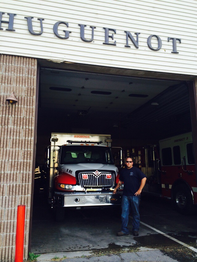It’s more fun to take it day by day and see how the adventure unfolds, anyway, and I was reminded of that as I happened to see a firetruck pass me that said Hugenot FD. It just so happened that this was the next town I’d be passing through, so I continued on to see if I could crash there, having had the kindnesses of so many Fire Departments across the country on my TransAm ride last year. Sure enough, there was one car outside, and its firefighter owner was washing it near the bay doors. I asked if I could set up my tent in an inconspicuous corner of their lawn for the night, and Bill agreed, and chipperly brought me and Tunes a gallon of cold spring water! Great success.