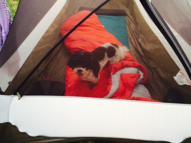 It was only 5:30 after a hilly 55 mile day, but I was ready to park it and so was my little buddy after a riveting game of fetch– and by fetch, I mean, Petunia runs around with the tennis ball and I chase her, until she stops, I approach from a distance, and she bolts off with it again. I set camp between two trailers, rinsed a few clothes, re-organized some panniers, watched a swarm of cars and trucks pull into the parking lot when an emergency call came in, and waited until it was almost dark to begin my day’s final ablutions. Stealth-bathing outdoors by way of three tepid water bottles while swatting away rapacious mosquitoes is not for everyone. And while it’s not my favorite pastime or anything (although I am starting to see a pattern develop with this bike touring thing…), there is something real and important about eschewing modern comforts and conveniences, atavistically enduring the unpleasantness of the natural world in order to come closer to it. The feel of river mud between my clawing fingers, and of wet grass between my toes. Those were the moments when I could begin to talk to God, as far as I saw it.
