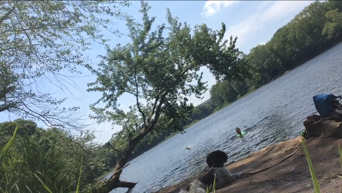 The Kittatinny Mountains were nothing to sneeze at– only the trees and grass were, for me– and I found myself once again doing one push up an exceptionally steep classic-Poconos mountain. Then 28 miles in and without any services around, we began to run out of our 6th and final water bottle. I took a chance by bumping over a rocky, unpaved side road into the Delaware Water Gap National Recreation Area, but their alleged bathroom was austere even by Portapotty standards. But the gravelly detour wasn’t for naught. Tunes and I climbed down a little sandy hill and went for a refreshing swim (bath?) in the Delaware. Well, I went for a swim, but she is not a big fan of the open water. There goes my buddy-triathlon hopes for us.