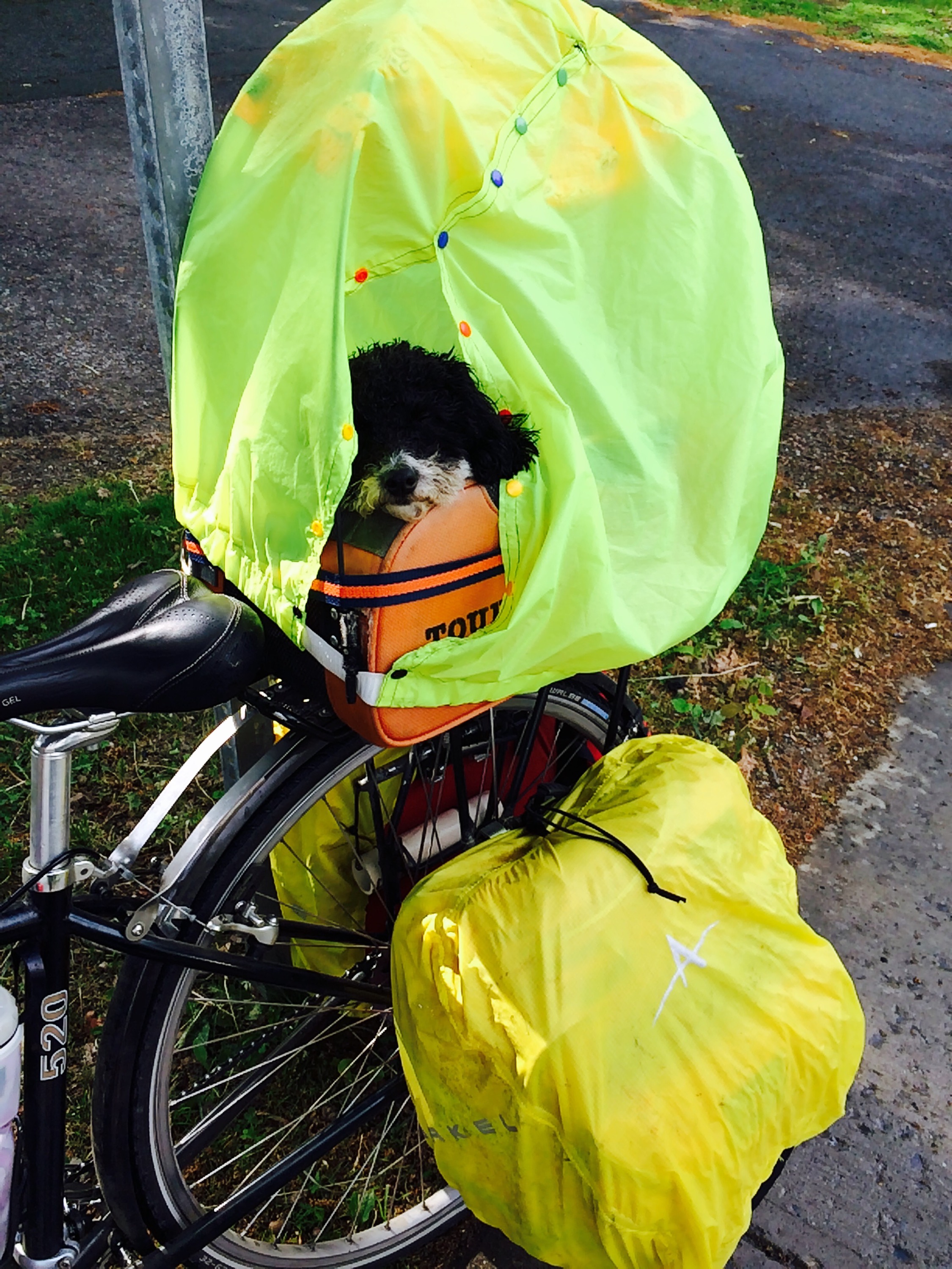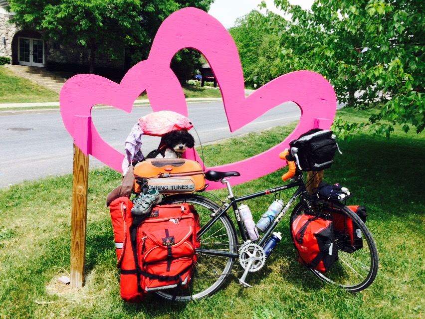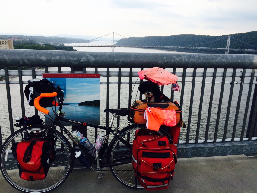 The pedestrian bridge was followed by a nice jaunt on a really well-maintained rail trail towards Vassar where Marc works, and as the rain came a little harder, I stopped under a small bridge to add Petunia’s rainfly to her rig, as she was not amused by the drizzle, and covered the rear panniers (borrowed a set of Arkels that are not waterproof). Another cyclist on a lithe road bike passed me and smiled at my setup, saying “Mars or Bust!” which was pretty funny because I really do look a bit alien with my antannae rear-view mirror off of my bugged-out orange rim sunglasses on this strange machine with Toto on board. We chatted for a few minutes, discussing touring and the lifestyle choices one makes if one wants to adventure like this. He had hiked the AT, and began quoting the Bryson classic A Walk in the Woods to my amusement. It was a pleasant encounter to share with someone who “gets it” about the bike touring bit.