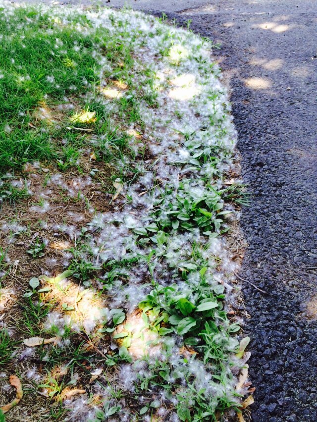 Downy tufts of pollen swirled through the air like I was in a snow globe, and it collects on the streets.