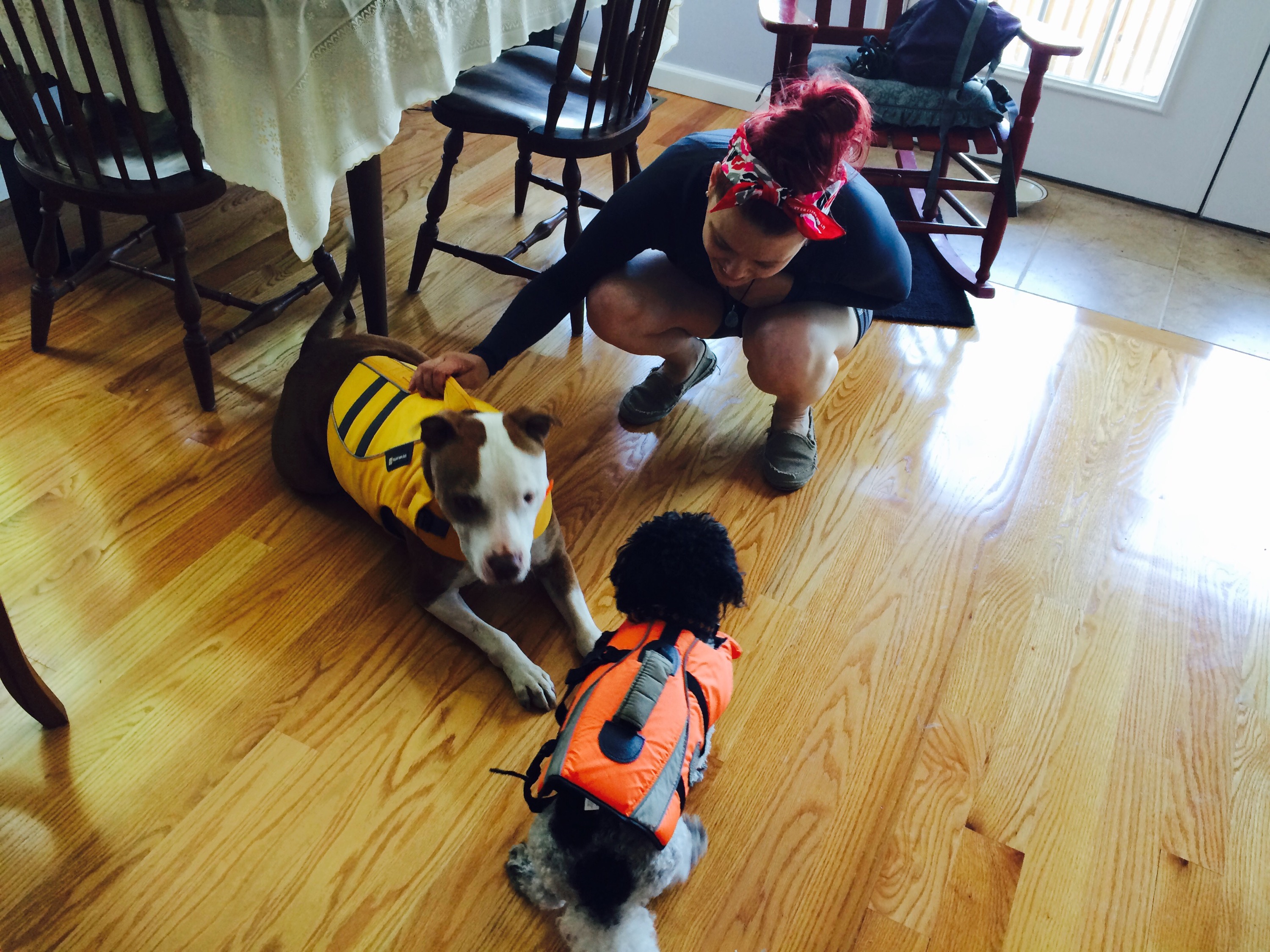 We paddled across the lake and made it to a small beach, where Tunes and D bonded over their shared love of running in huge circles and bounding along invisible racetracks, enthusiastically welcoming the opportunity to play on dry land. Still wearing their PFDs, they were quite a sight, these two happy dogs in puffy vests, careening around patches of trees and over sandy beachfront.