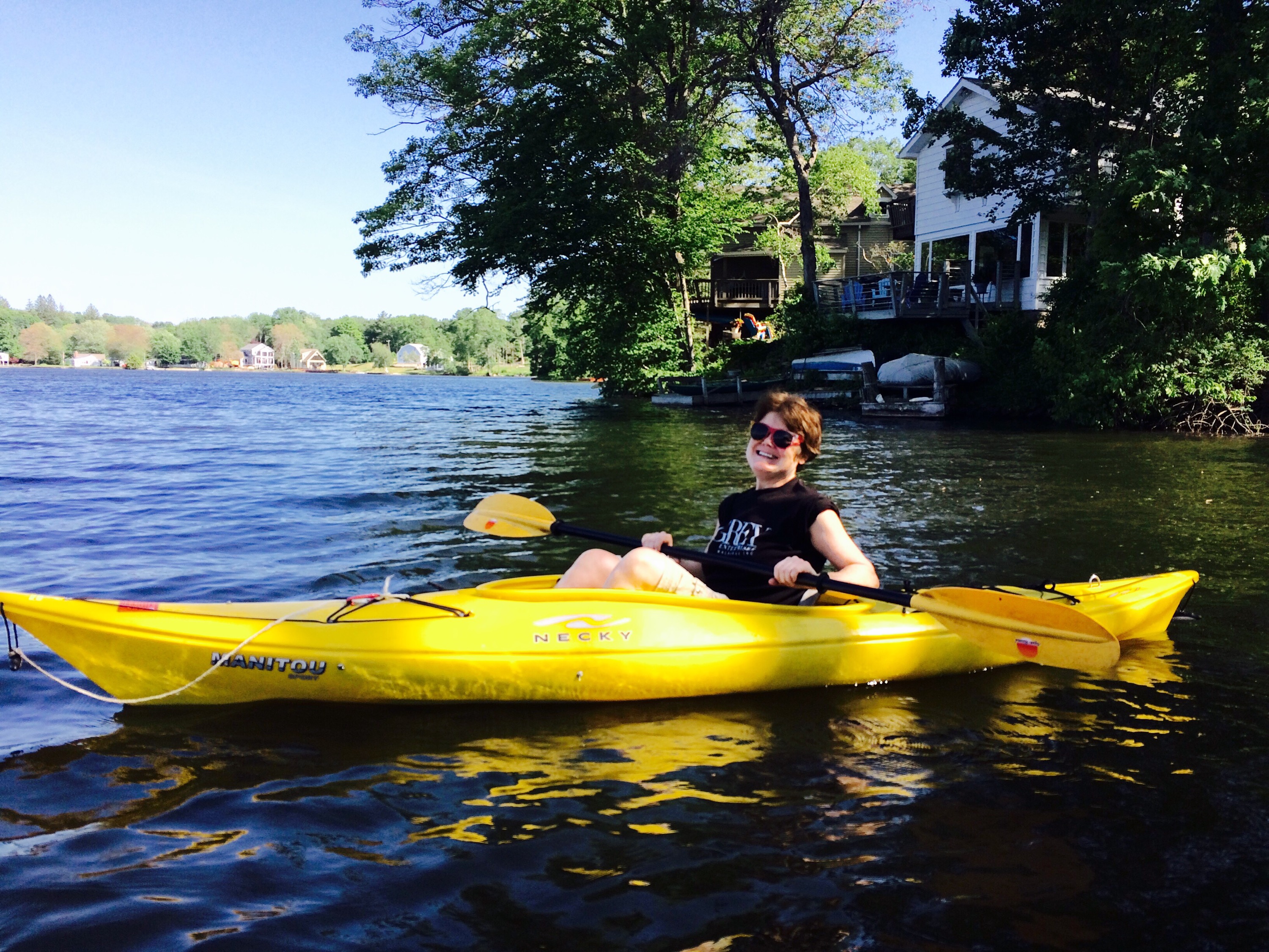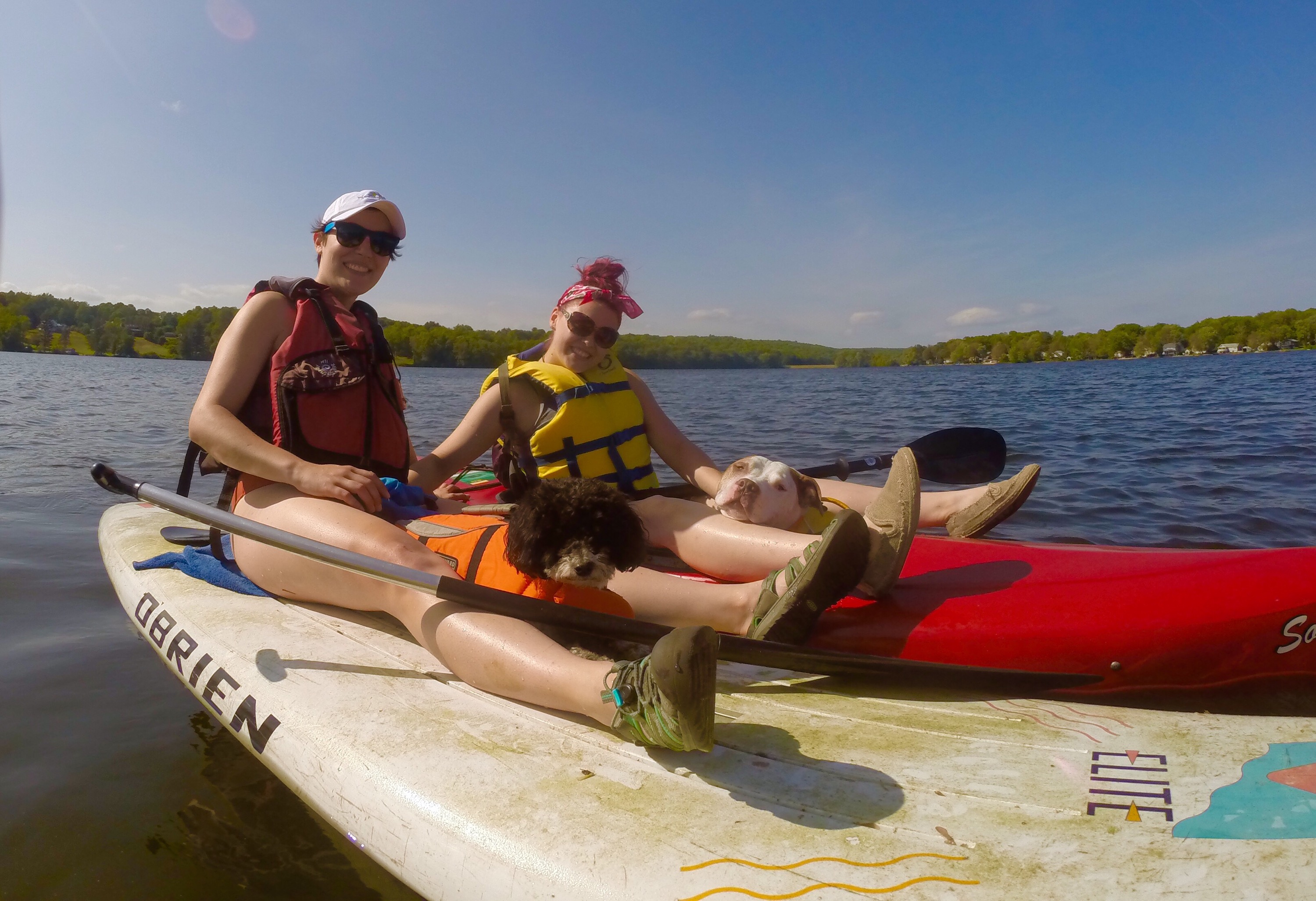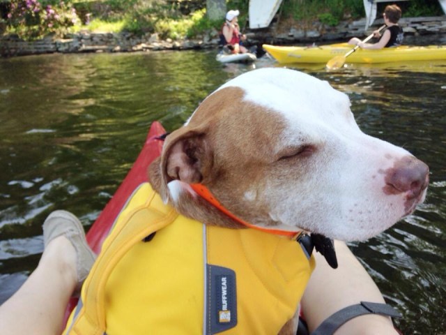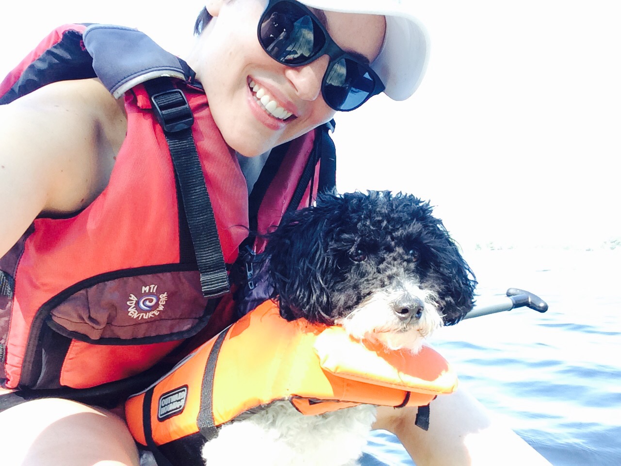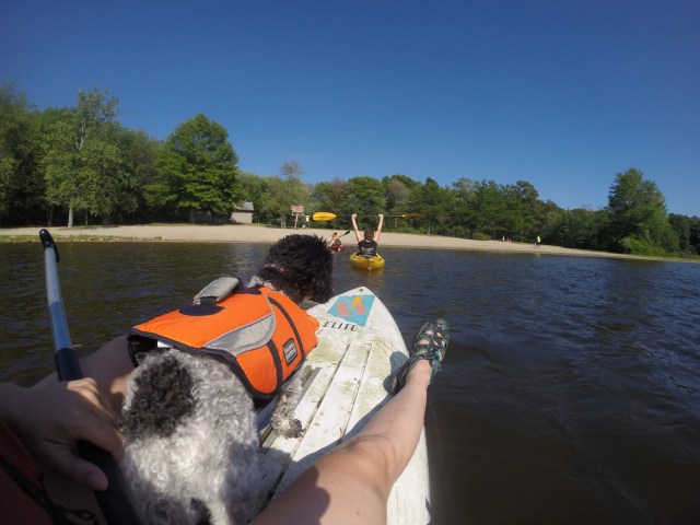 Outfitted in his stylish yellow Personal Floatation Device, “D” enjoyed a kayak cruise with his mom, and Pam went out on a nice yellow kayak, although she left her two aquatically disinclined kitties at home. I attempted to stand-up paddleboard with a kayak paddle and then a short paddle before ultimately taking a seat to avoid accidental cow-tipping, as Tunes was between my feet.