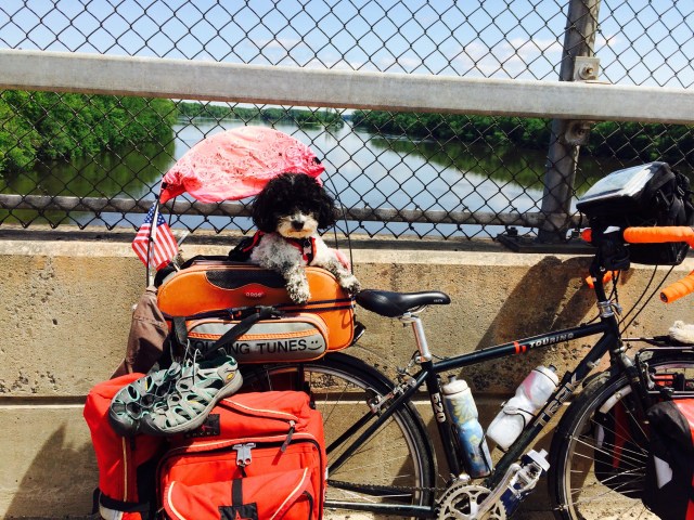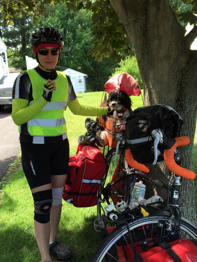 A bigger black and white dog was bounding around the baseball field, chasing tennis balls her owner was pinging to her with a racket. “Friendly?” I called over from far outfield before letting Tunes off her leash. “Oh yes, very. That’s Sarah,” her owner shouted back from second base. Once unhooked, Tunes literally ran circles around her new playmate with gusto and great agility. “I guess she’s done that once or twice before, huh?” Mister Owner laughed. I beamed, confirming that sprinting was one of Petunia’s greatest joys, and the dogs played together for a bit. “Can you believe,” the owner said after a few minutes, standing nearby now so that we weren’t shouting, “that she was just 4 hours away from being put down? It’s crazy. That dog is just so full of life.” I commended Sarah’s dad for being her rescuer, and soon they packed up into their pickup truck and headed off. I ate better than half of my large dish, shared some chicken with Tunes and we made our way up some more hills. A teenager on the sidewalk pumped a solidarity fist into the air and hooted, “You’re awesome! Oh, and CUTE DOG!” as I cranked through town. That always makes me smile, and never gets old.