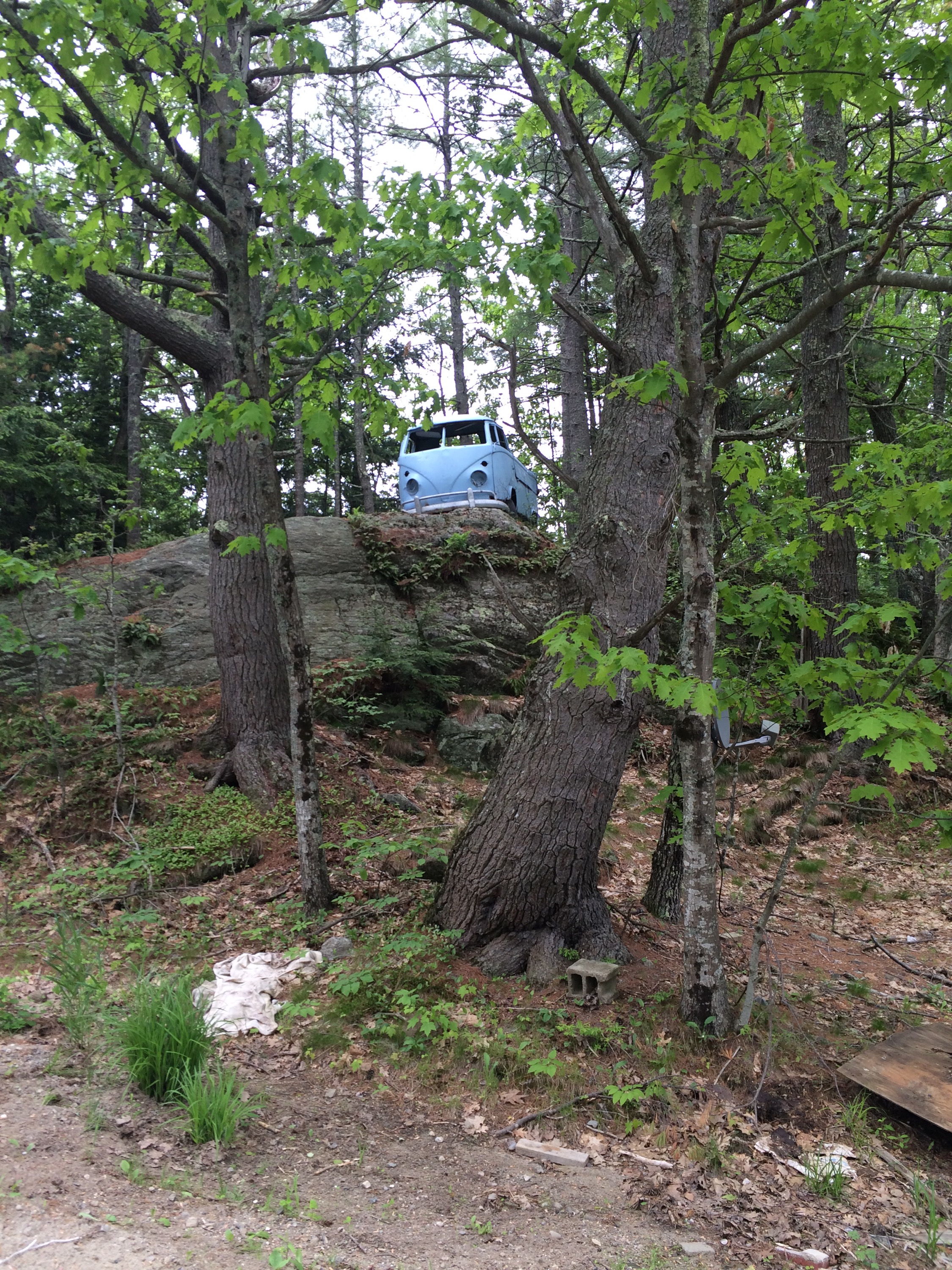 The drizzle and indeciscion were muting my good spirits slightly, so I tapped on my go-to happy place to amuse myself. TouringTunes has sort of a double meaning– Tunes is one of Petunia’s many nicknames, but I’m also crazy about music and enjoy the company of the tunes playing on my little radio, or sometimes I just sing loudly while rolling down the street, unashamed of my pinched and scrawny voice. I saw an abandoned VW bus on a hill, and was inspured to serenade the woods with my rendition of “Goin up the Country” in my best Kermit the Frog-esque voice.