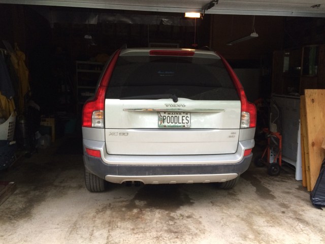 My Uncle Mike had arranged for me to stay with his brother and sister in law, Joel and Nancy, in Daramiscotta, another of the beautiful Maine coastal penninsulas. I was happy for the short and easy day, but I was also looking forward to meeting these distant relatives. My Uncle told  me in advance that they had bred standard poodles for 40-50 years, and I knew I’d arrived at the right house when I saw their poodle-decal mailbox, and all doubt was eliminated when I saw this car in the garage.