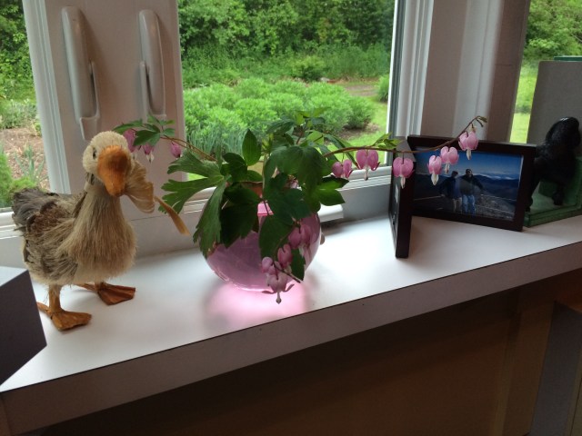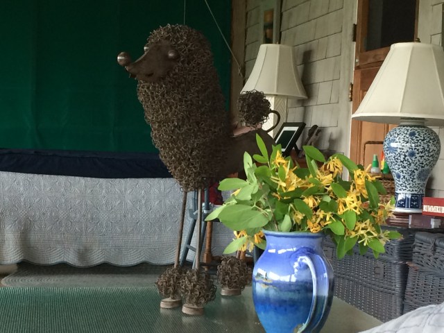 Where there were not poodles, there were flowers. When Nancy and Joel were first married she recalled that he’d been taken aback by her omnipresent  floral arrangements, exclaiming, “I feel like I”m living in a funeral parlor!” Dainty and fragrant grape-jelly colored lilacs, soft honeysuckle, and towering lupins were artfully arranged on nearly every table in every room of the house, including the large screened-in patio. It was really remarkable. And Nancy was readying more bouquets in preparation for a visit from her sister and brother in law, Mary Beth and David, who were hailing from Utah/Alaska (they have a home in each state, but I can’t remember which one they flew in from!), after driving up from their college reunions in CT.