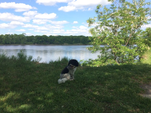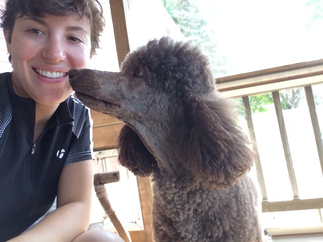 I got up at 5:30 the next morning, and quietly as I could, used the time to grease my chain, put away the clean clothes that my hosts had kindly let me wash, inflate my air-horn to maximum honkitude, check my tire pressure, clean the cushy inside of Tunes’s carrier, prep my water bottles, trim my pup’s face hair a bit (this seemed like an appropriate venue), unpack my tent to clean and dry it, check maps, charge electronics, and read a silly book of New Yorker cartoons about dogs.