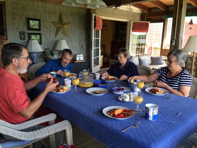 When the rest of the household came to at about 9, we assembled a fruit, toast, and sausage breakfast with coffee, and enjoyed the warm summery weather on the patio.