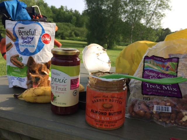The late start and a few stops meant that it was another low-mile day, but who’s counting? It was an awsome day. I made myself supper in Durham, enjoying a fancy espesso-bean and vanilla peanut butter and banana sandwich on an English muffin, with some dried fruits and a chocolate-covered graham cracker. YUM. Having missed out on the lawbstah, Tunes had her usual wet food mixed with dry kibble, eagerly chowing down. She ran a couple of miles on a bike path earlier, which seemed to be the highlight of her day.