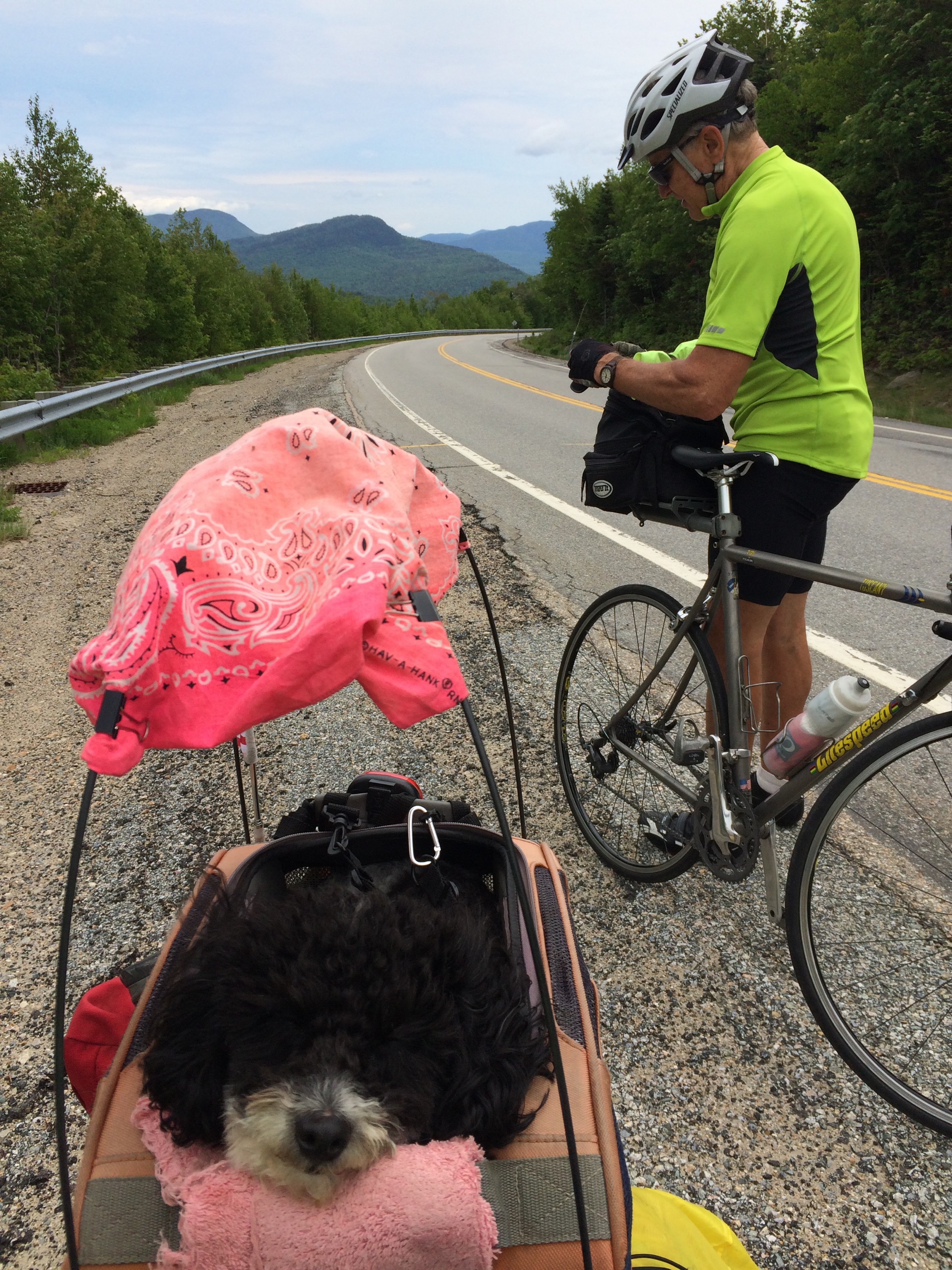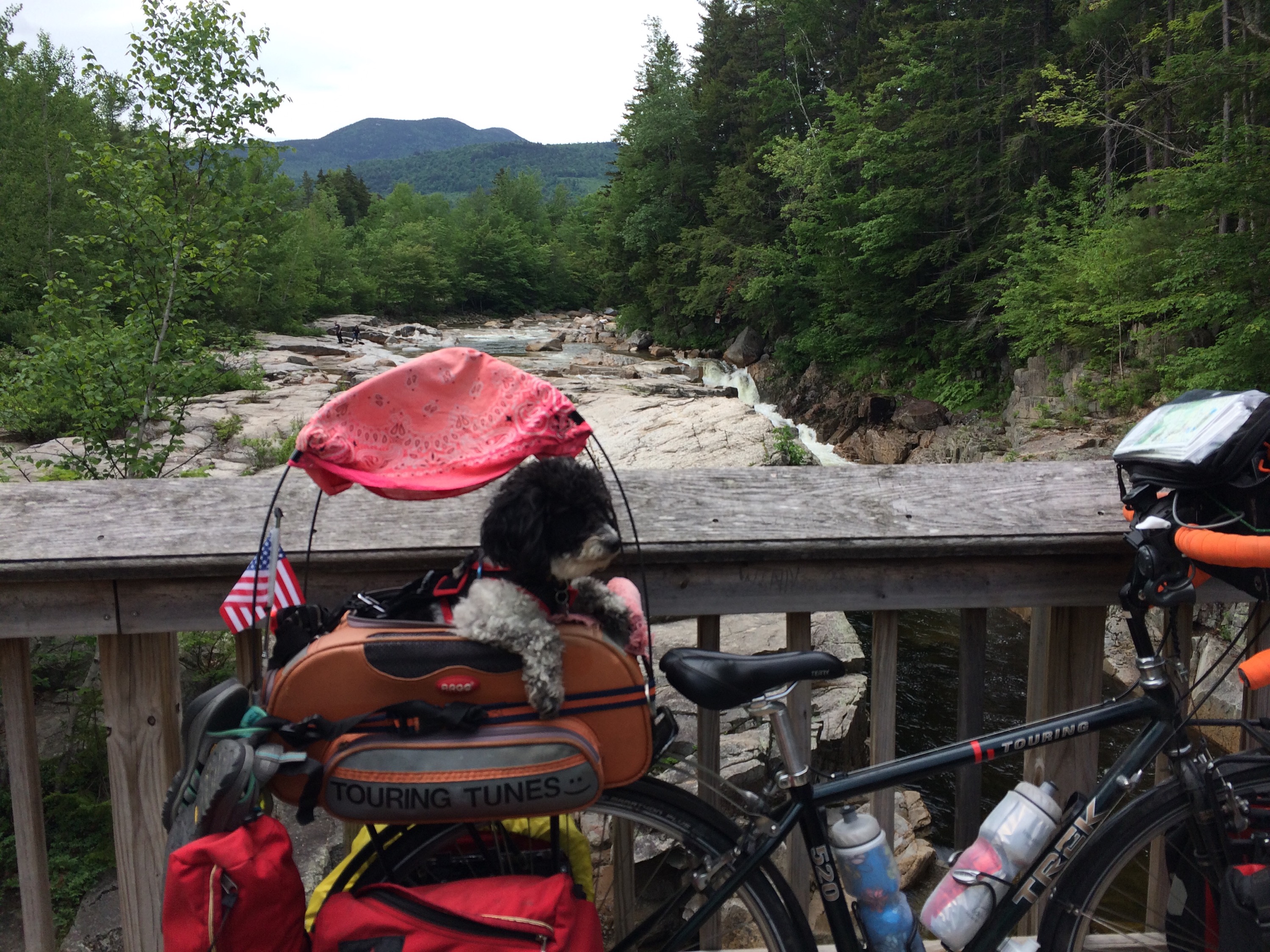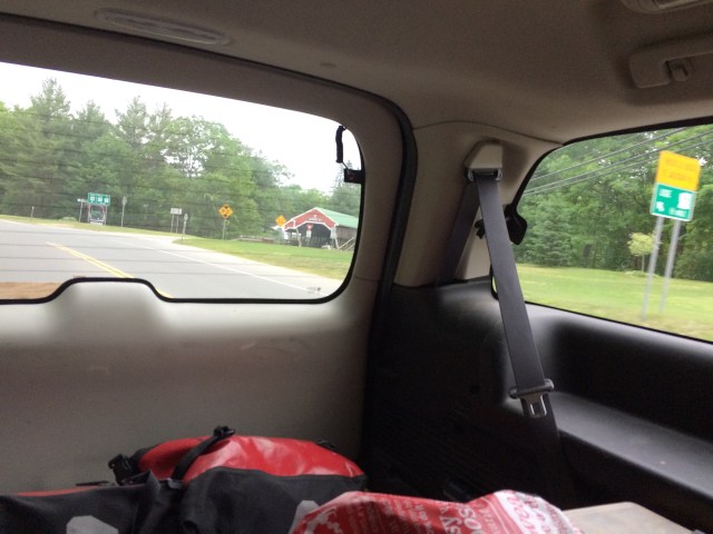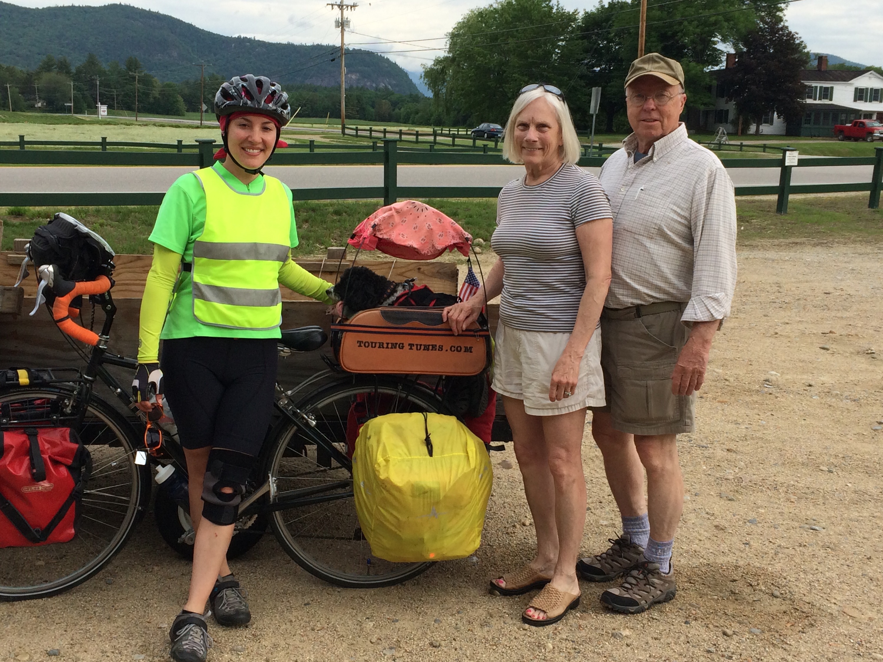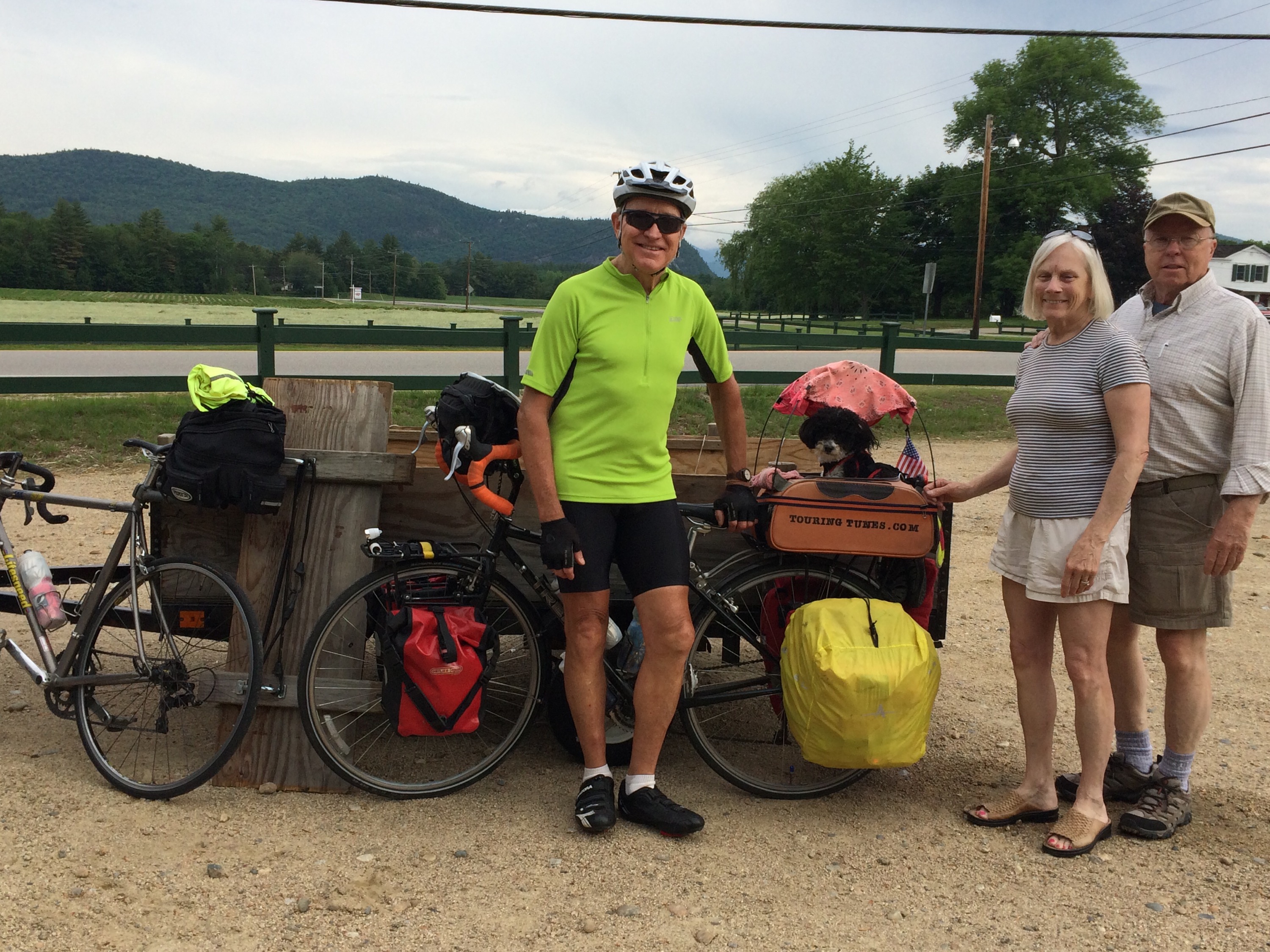After 5 PM, I’d reached the small town of Fryburg, ME, a stone’s throw from the New Hampshire line, where I’d be re-entering the state to continue west. My Uncle Mike, unofficial hospitality coordinator, had reached out to his cousin Connie in Jackson, NH, to see if I could crash there that night, but by the time I’d reached Fryburg, I called her to apologize that I couldn’t push the extra 15-20 miles up to their place. Undeterred and exceptionally sweet, Connie and her husband Bob offered to come pick me up and host me for the evening. We loaded the bike and gear into the back of their SUV and I compactly reposed upon the tops of the folded forward seats in the back with Tunes scrunched up next to me as we hurtled over Hurricane Mountain, a local hiker’s dream, an enjoyably scenic and rugged jaunt across the border and to their home.