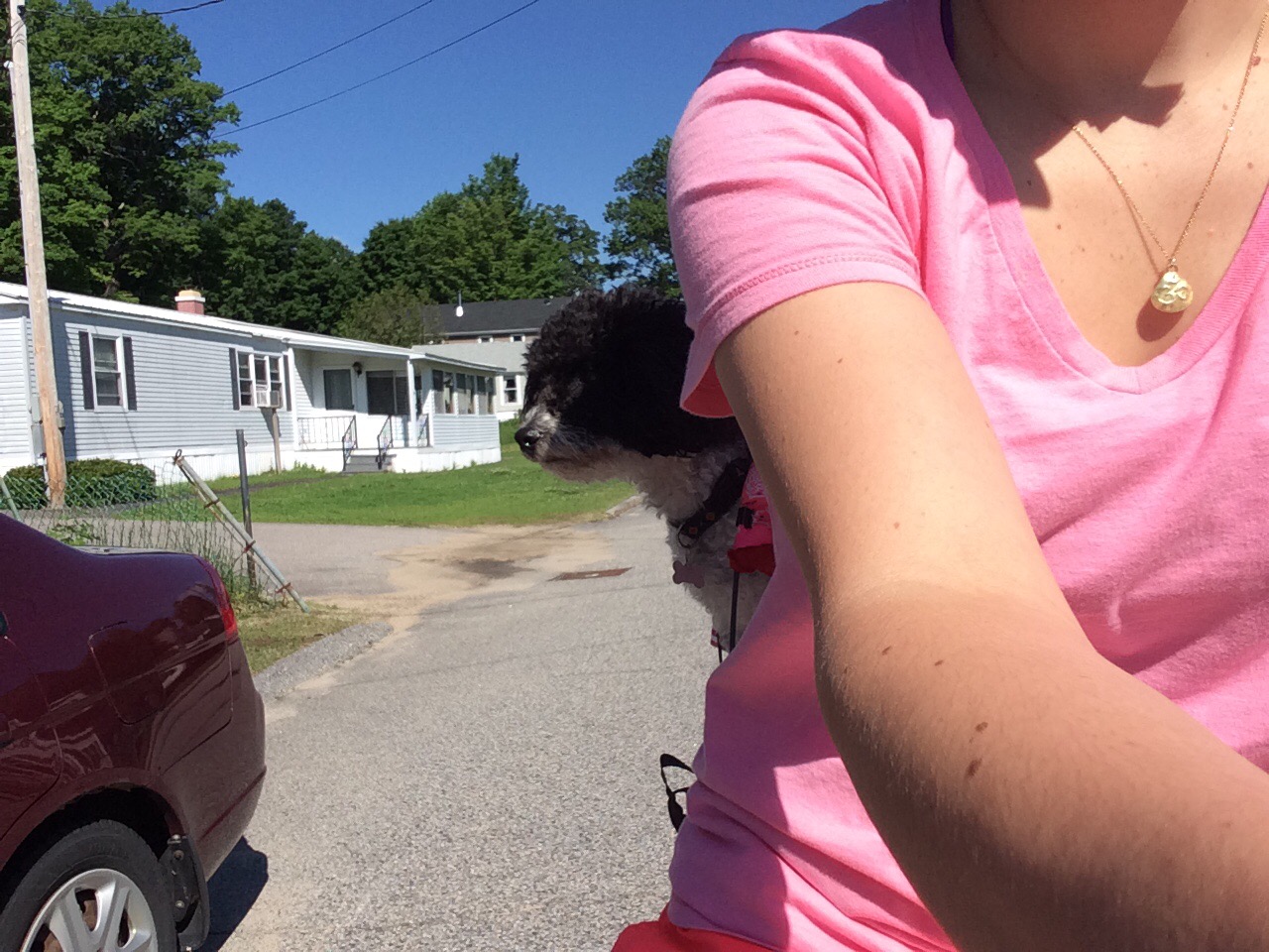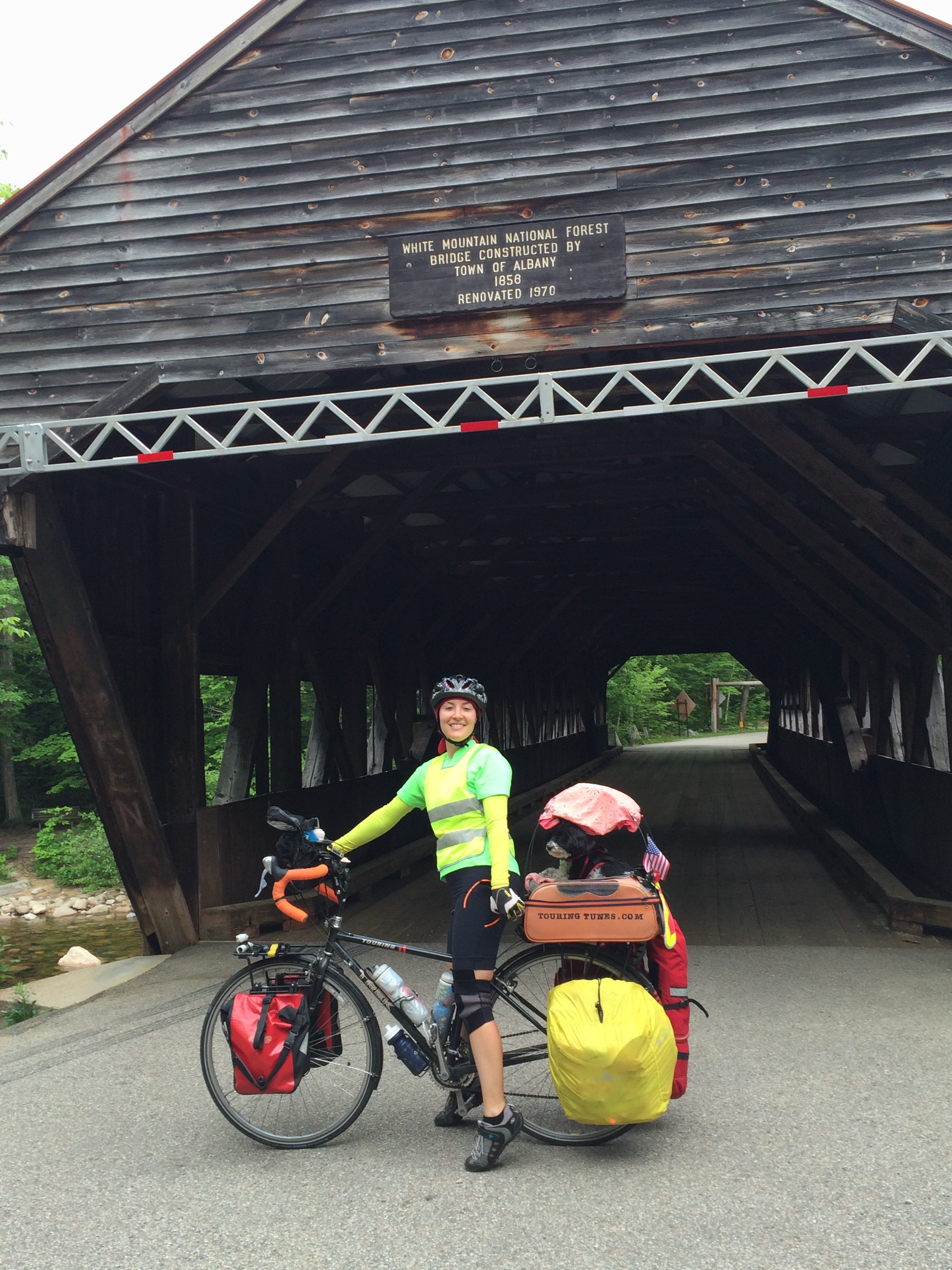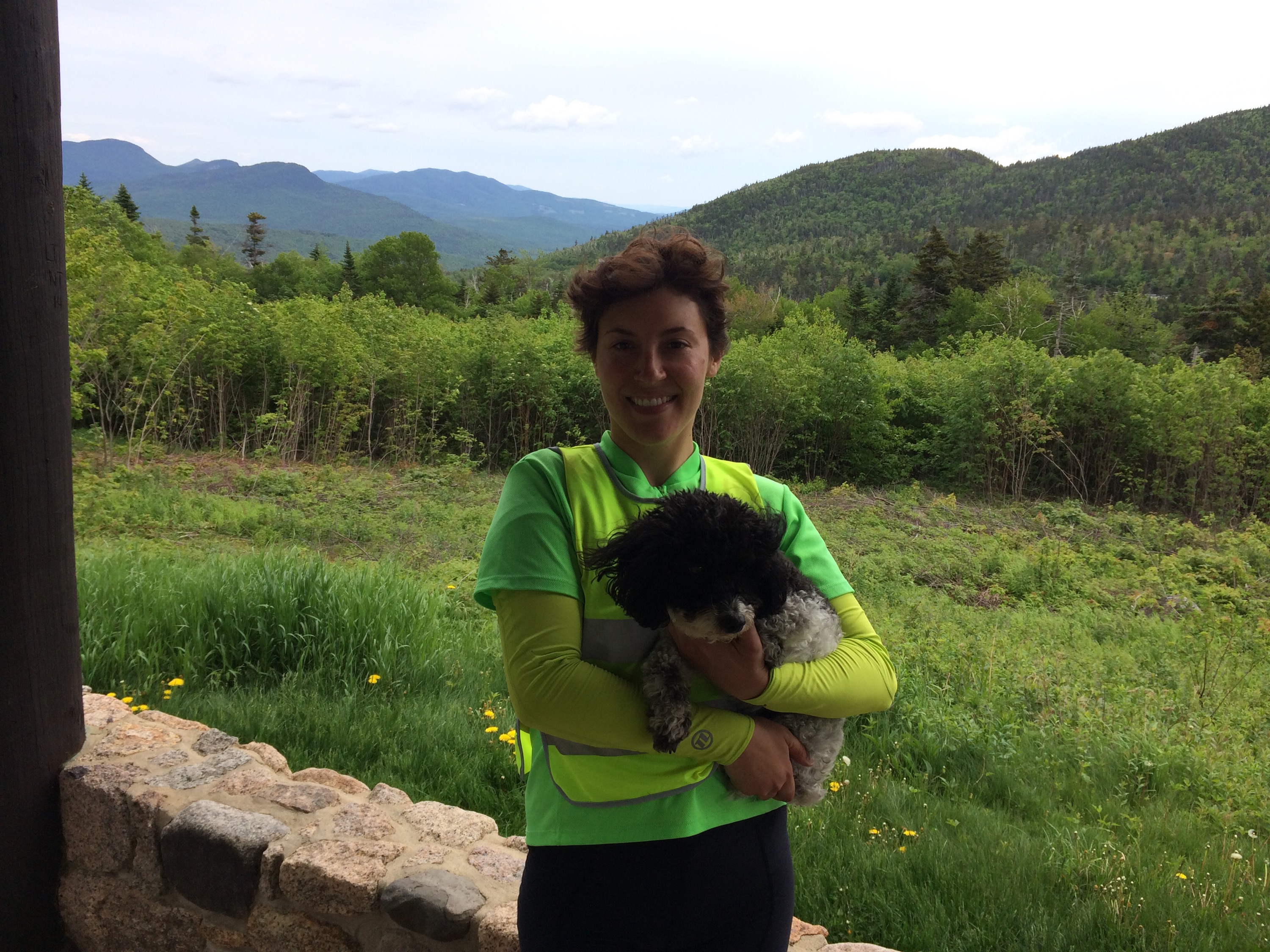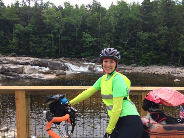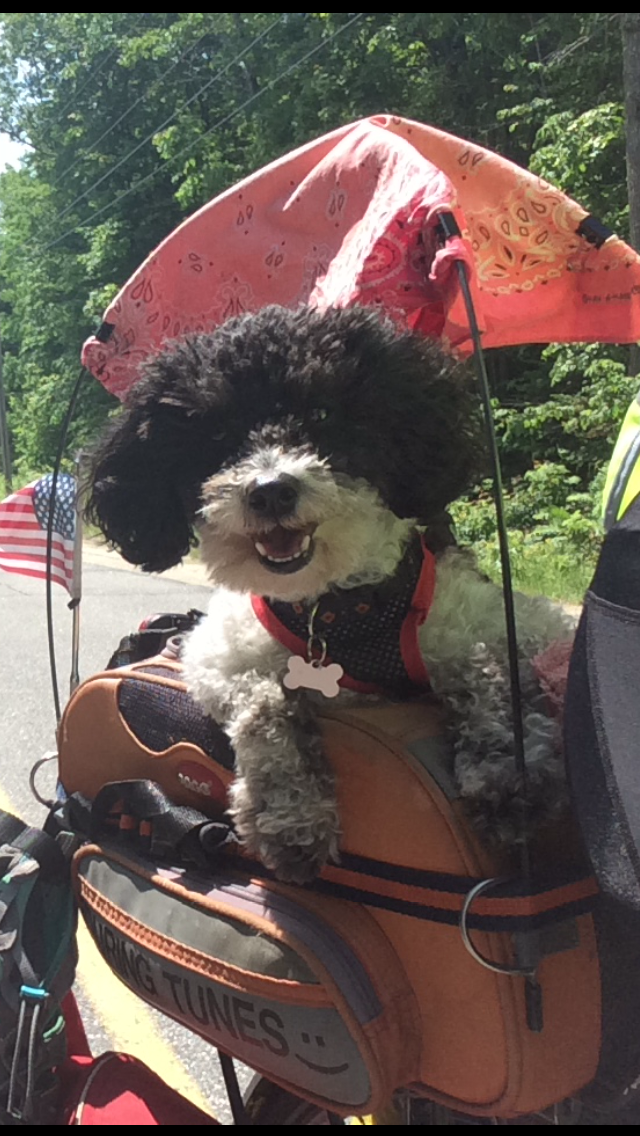 After 5 PM, I’d reached the small town of Fryburg, ME, a stone’s throw from the New Hampshire line, where I’d be re-entering the state to continue west. My Uncle Mike, unofficial hospitality coordinator, had reached out to his cousin Connie in Jackson, NH, to see if I could crash there that night, but by the time I’d reached Fryburg, I called her to apologize that I couldn’t push the extra 15-20 miles up to their place. Undeterred and exceptionally sweet, Connie and her husband Bob offered to come pick me up and host me for the evening. We loaded the bike and gear into the back of their SUV and I compactly reposed upon the tops of the folded forward seats in the back with Tunes scrunched up next to me as we hurtled over Hurricane Mountain, a local hiker’s dream, an enjoyably scenic and rugged jaunt across the border and to their home.
