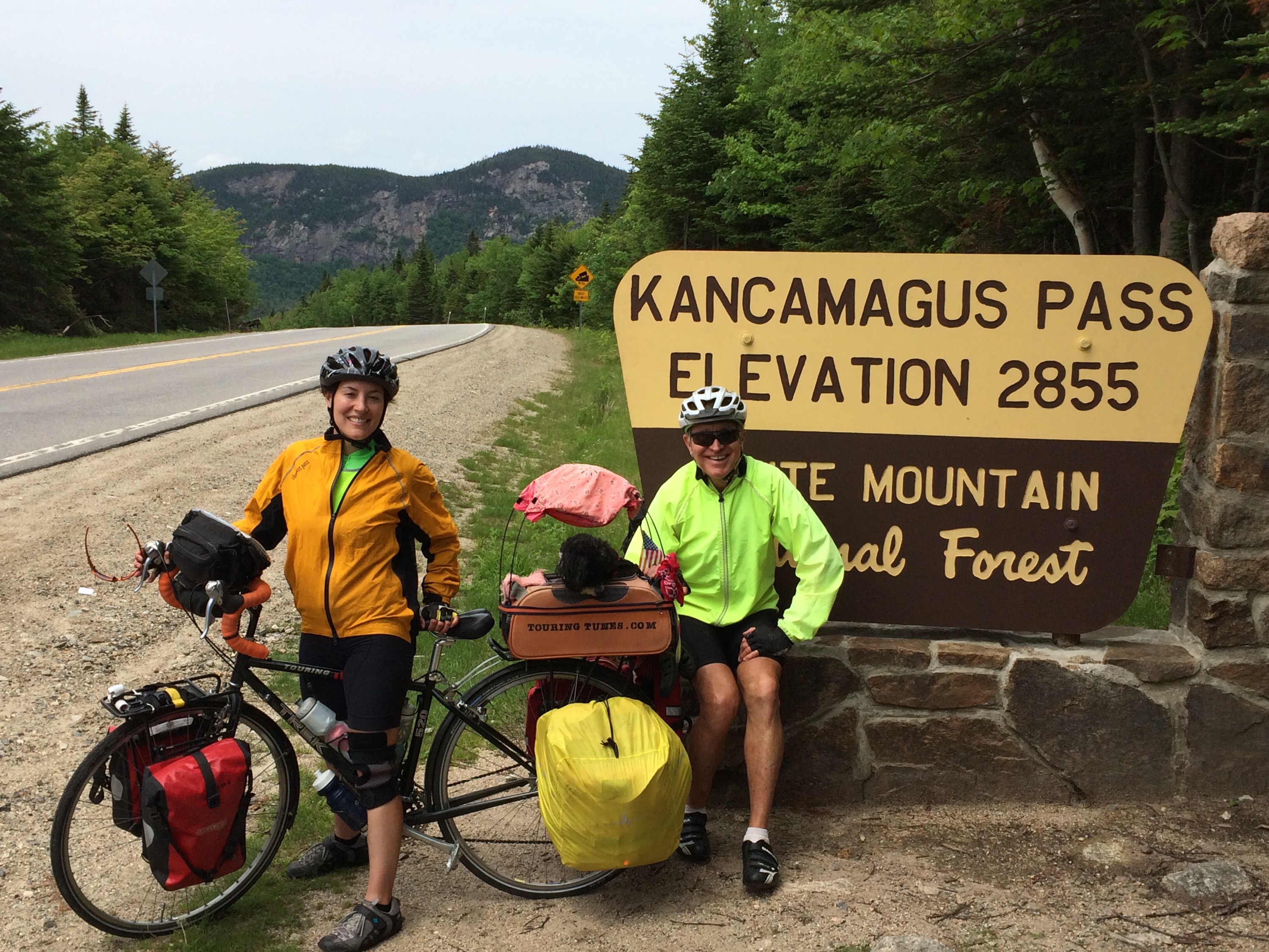 At half past noon, I finally reached the summit, and we took lunch together. Peter shared his carrots and grapes, and I made a PBJ while Tunes had a little chewy treat. After several days of worry that I would hurt myself trying to climb this thing, burdened by the weight of my self-supported mobile home, it was nothing short of life-affirming that is done it without too much pain or suffering, and that I felt pretty good overall at the top. I was thirsty, however, and I’d totally run out of water, but when we were looking around for a well pump, a vacationing couple noticed my predicament and furnished three bottles of water, so that Tunes and I both had plenty. He was celebrating a 30+ years anniversary (35, maybe? I forgot) with his wife, enjoying the mountains and staying at the Wentworth, a fancy and well-known hotel in the area. I was grateful that they’d come to my rescue, just in time, with just what I needed. It was a lovely lunch, and then Peter and I went our separate ways just before I made the plunge downhill, speeding the remainder of the 35 mile total route, from Conway to Lincoln, over the Kancamagus highway.