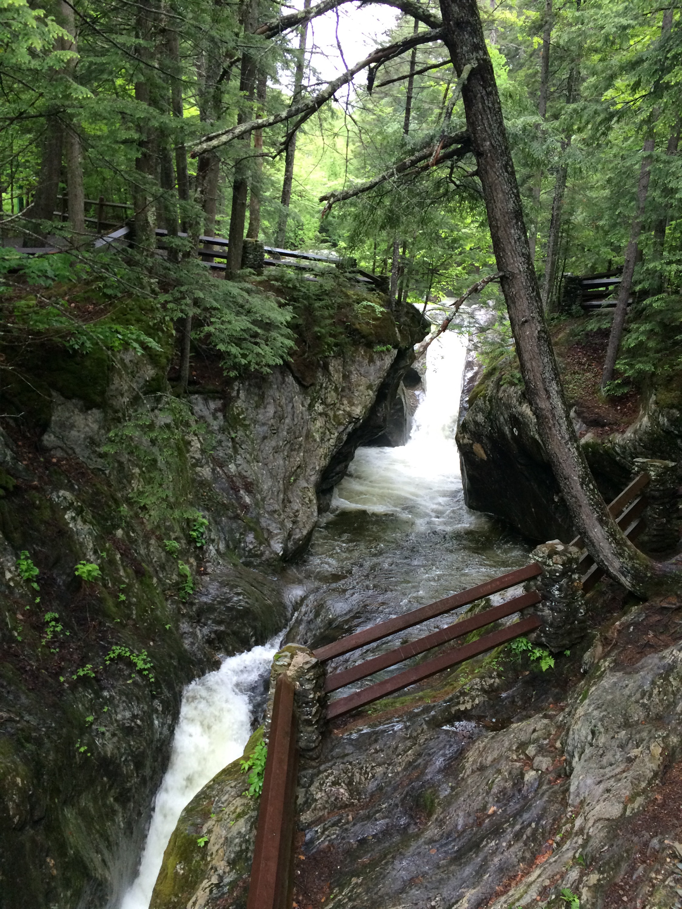 Petunia and I stopped across the street at the Green Mountain Bike Shop to put some air in the tires, as the previous 20 miles had seemed unusually slow and I’d noticed that the rig below me was flop-flabbing over the cracks in the old mountain roads intsead of crisply popping me right over them. We then started the thousand foot climb over Bread Loaf in the rain. First, we stopped at the Texas Falls at Thatcher’s recommendation. It was a nice spot to listen to the rushing water that had carved different half-domed and circular shapes in the rocks below. Petunia was wet and not particularly impressed, although happy for a pit stop.