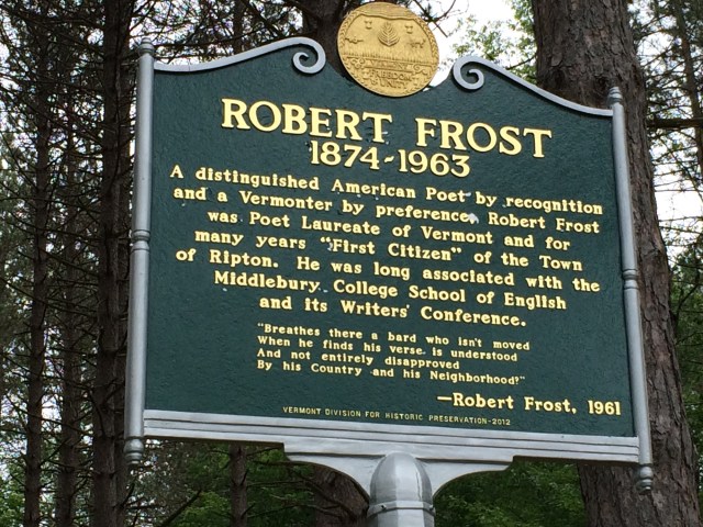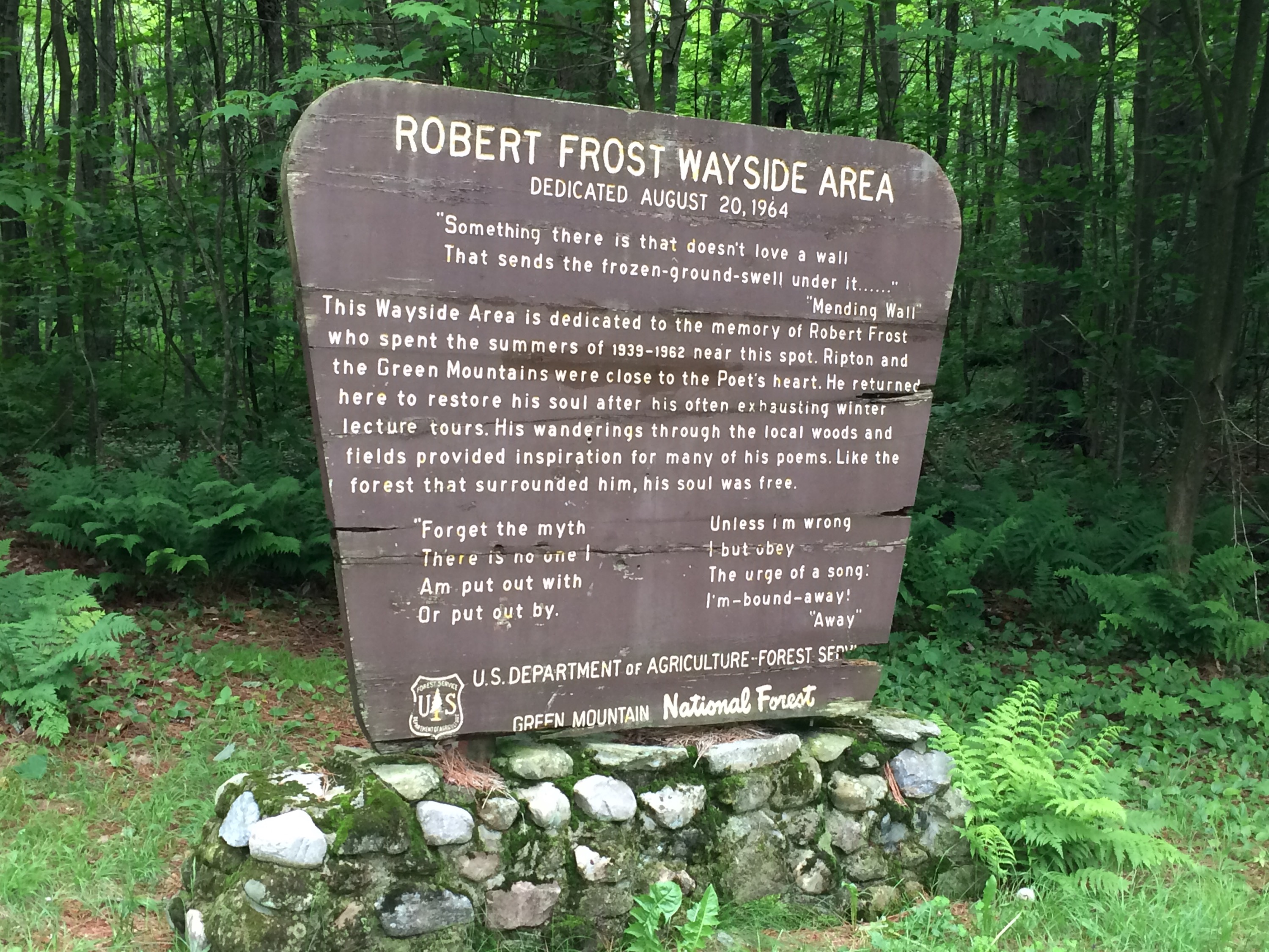 And coming down was almost better than flying. It felt like the unending downhill, including a sharp pitch 15% downgrade that was straight and wide enough that I hit about 40 mph. We passed Middlebury College and stopped to see the Robert Frost dedicated woodsy spot, which made me think of my grandmother and might’ve been a good spot to sit and write or read, but for the bone-soaked chill that I needed to keep moving to escape. My rainjacket, a used ebay super discount on a very fancy brand, was unsurprisingly not very waterproof, or perhaps my body was far from sweat-proof and I’d soaked it from inside out. Either way, it wasn’t a good day for sitting around in wet clothes, and I wanted to hit a town and re-provision soon.