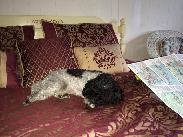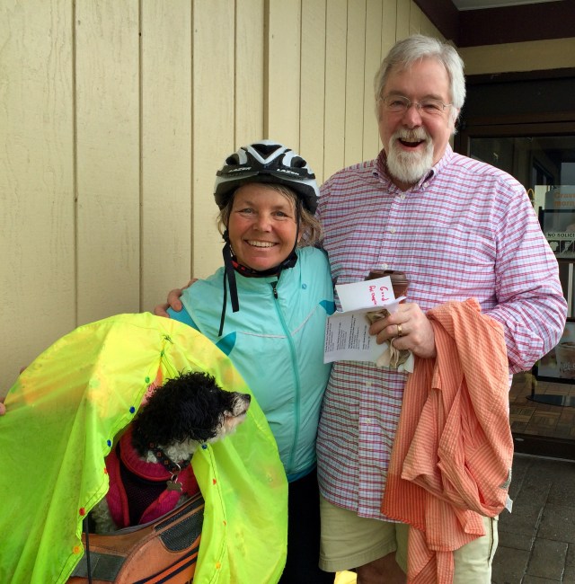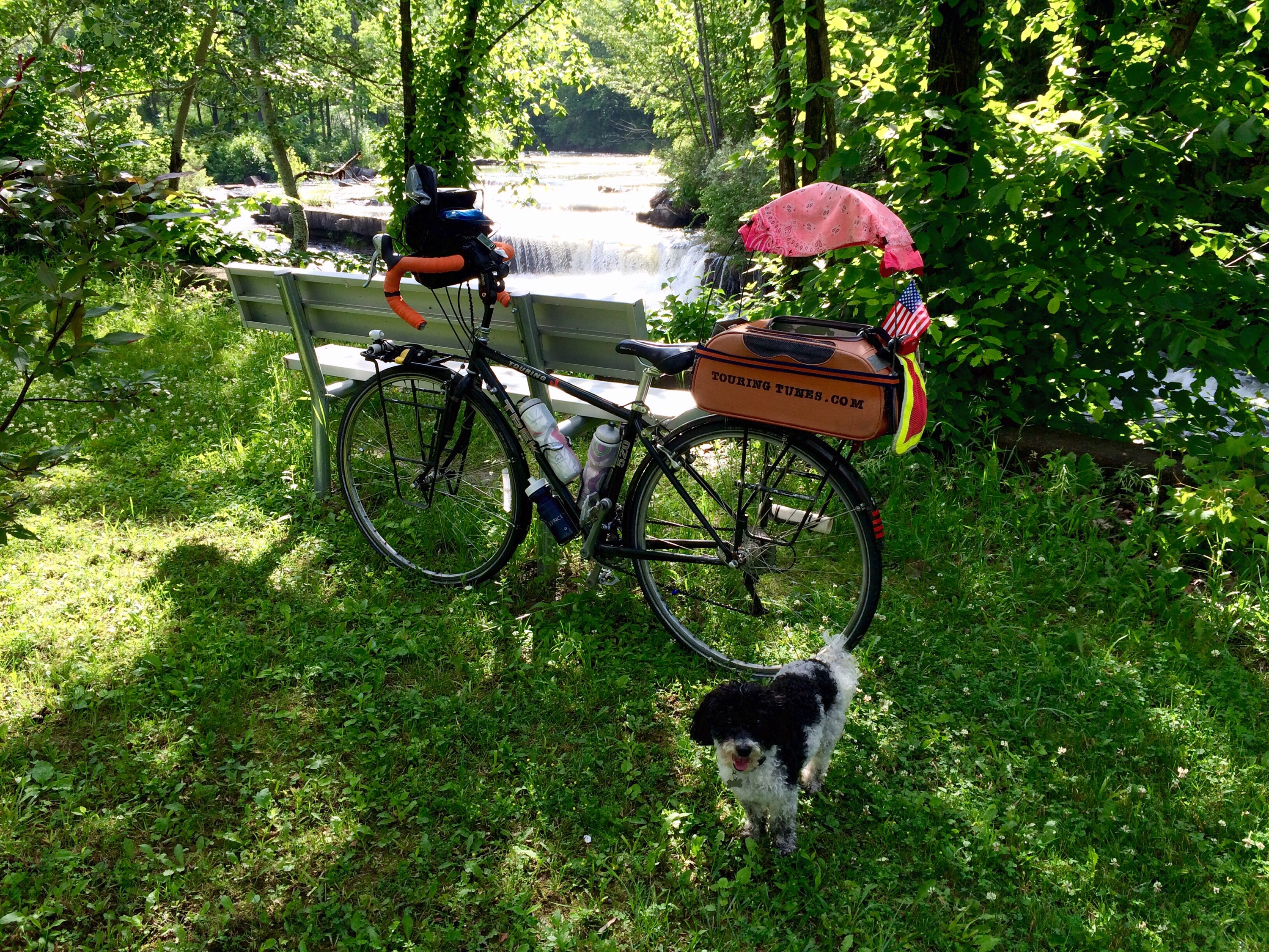 We decided to hang out a while and have a late breakfast/early lunch under the overhang of the Shoreham library. Even though it was closed on Tuesdays, they had a few picnic tables and I caught up on some reading, writing, work, and Petunia was fed and we played in the big field with her squeaky toy for a while. The rain slowed, and before we were finally ready to move forward, we stopped in nextdoor to the cottage-sized town office building. The woman at the front desk very kindly allowed me to use the restroom, fill my water bottles, and she even offered chocolatey treats from her candy dish. She asked if I was following the Adventure Cycling route, and I knew this woman knew bike touring! She told me her former boss had done a long north-south cross country tour, and that sometimes he’d called the office, demoralized in a tent somewhere in the rain eating the only thing he could find–beef jerkey– and sought comfort from his colleagues. But the town clerk employee must have been an animal lover, because she understood that Petunia was my all-weather companion and confidante.