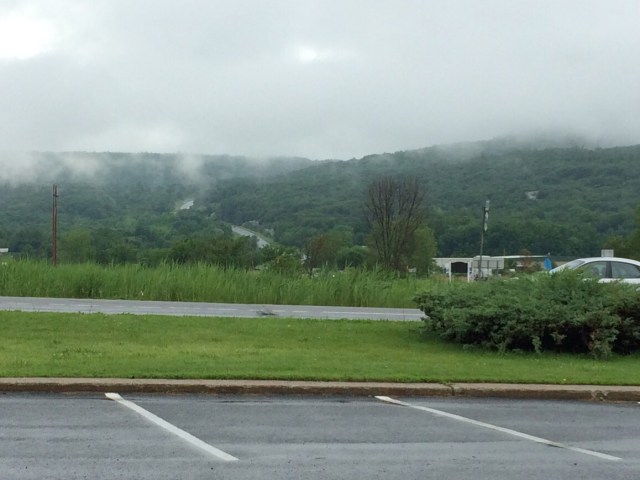 It was already getting well on into the afternoon, and I looked out across the way to see what looked like an unending ascent into the low, smoky clouds that were covering the Adirondack peaks. Yuck. I looked at Tunes, slumped down in her mobile home, full of burger and still displeased.