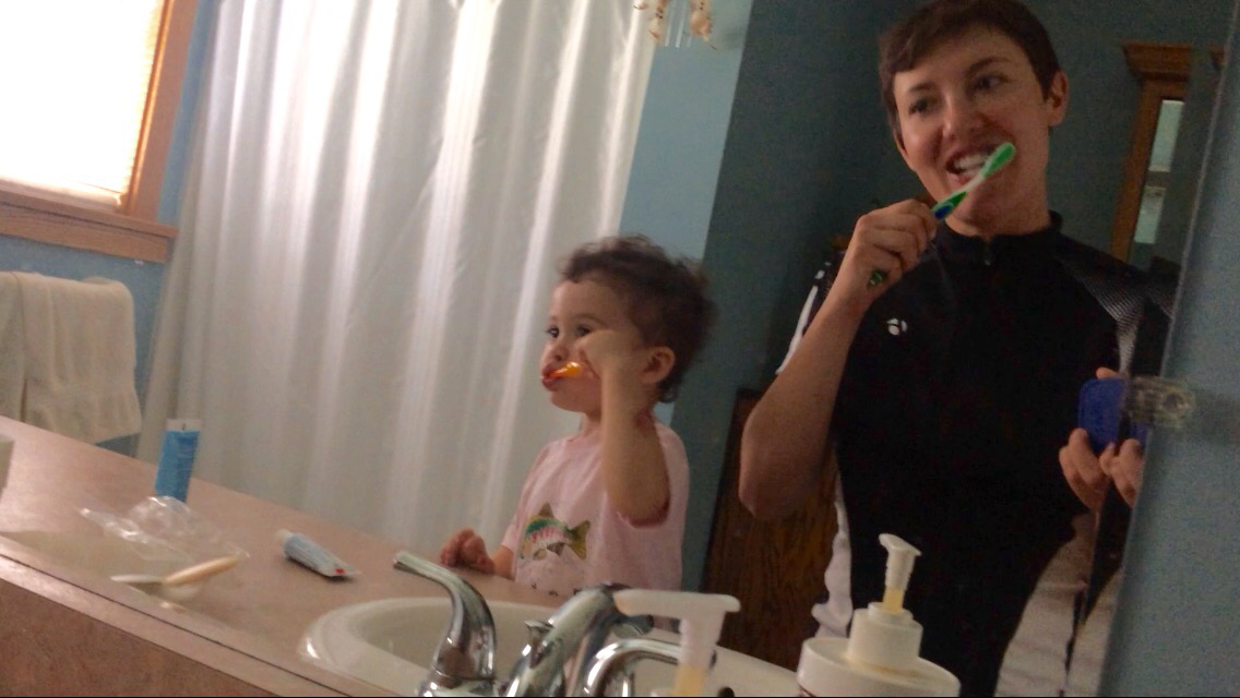 When I came to in the morning, Leo’s two year old granddaughter Olivia was there for family daycare. Cute as a button and curious about Tunes and me, she was definitely the pride of the household. When she saw me brushing my teeth, she dragged a stepstool over to the sink and emulated my hygienic efforts. Slightly self-conscious of my role model status, I carefully coached her and congratulated her on her dental health.