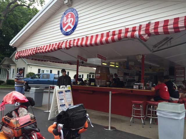 Despite a few drizzly moments, it was faily nice by midday, and that’s when I relinquished my control over roadside restraurant cravings and stopped at a 50’s retro outdoor diner called the White Turkey Drive-In. When I pulled up with my loaded bike and doggie, I felt the burger-mongering crowd’s conversations screech to a halt as if someone had stopped the needle on the diner’s vintage record-playing jukebox. I splurged on a root beer float, and Petunia sat on my lap and ate vanilla ice cream, and when one patron was willing to start the conversation, I gave my succinct travel story just slightly louder than necessary so that all who were obviously interested could hear.