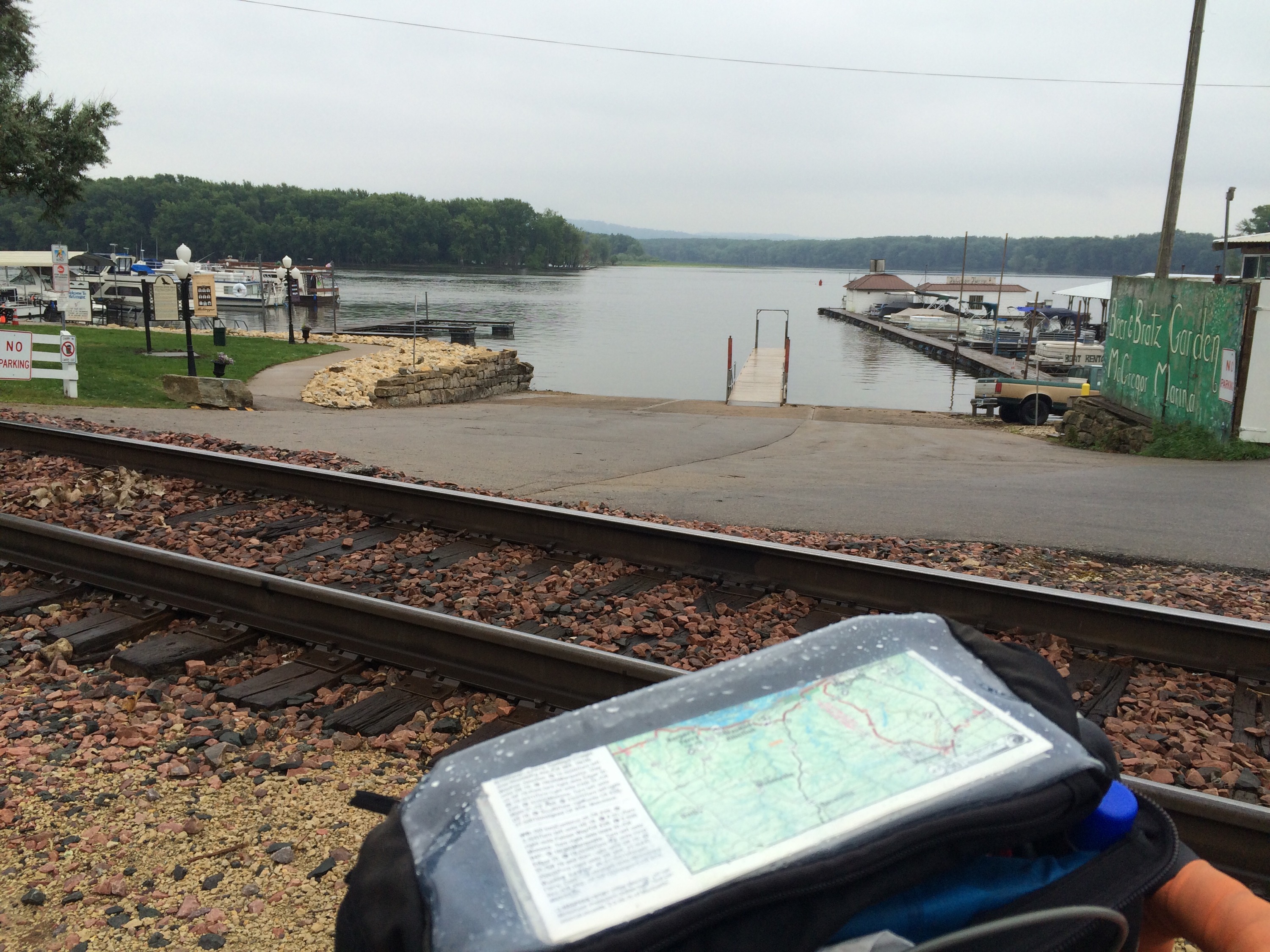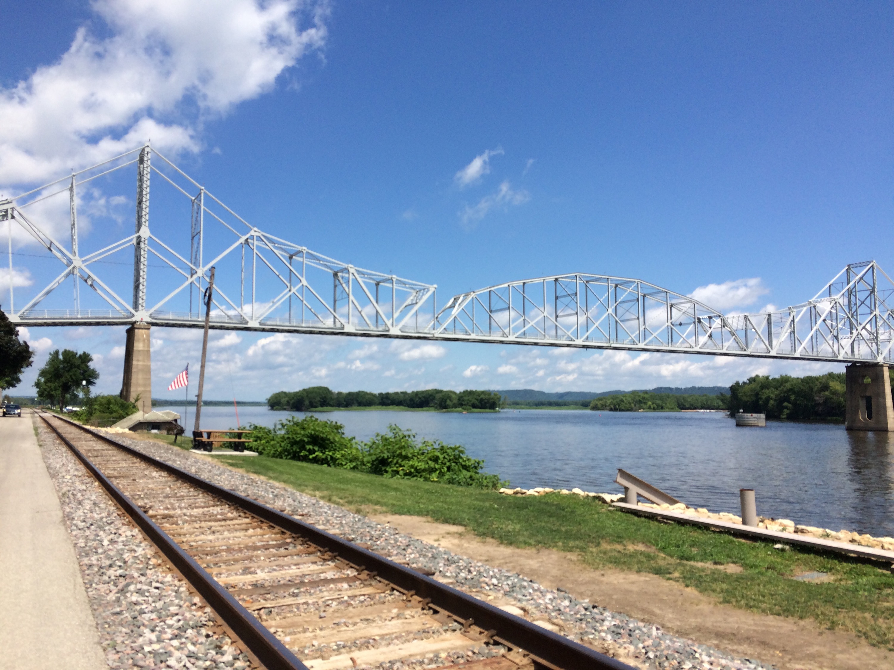By early evening, I got to the small river town of Harper’s Ferry, MN, and happened to see a couple of guys talking on their front lawn. I asked if they knew who I could talk to in town who might permit me to tent camp in their small park on the edge of town, and one man said he was on the town council and didn’t have any problem with that. I went to the local library, which was miraculously open until 7 PM, and washed up in their bathroom, sent a couple of emails and charged devices, since I hadn’t had cell phone service in a few days. When I returned to the city park and began to set up the tent, a dark haired man pulled up with a golden dog and a lawn mower both riding in the bed of his pickup truck. He came over to find out about my travels, and said he felt like he had deja-vu because he’d spoken to a cyclist last year who was also riding across country from Maine to Washington and had a similarly loaded up bike.