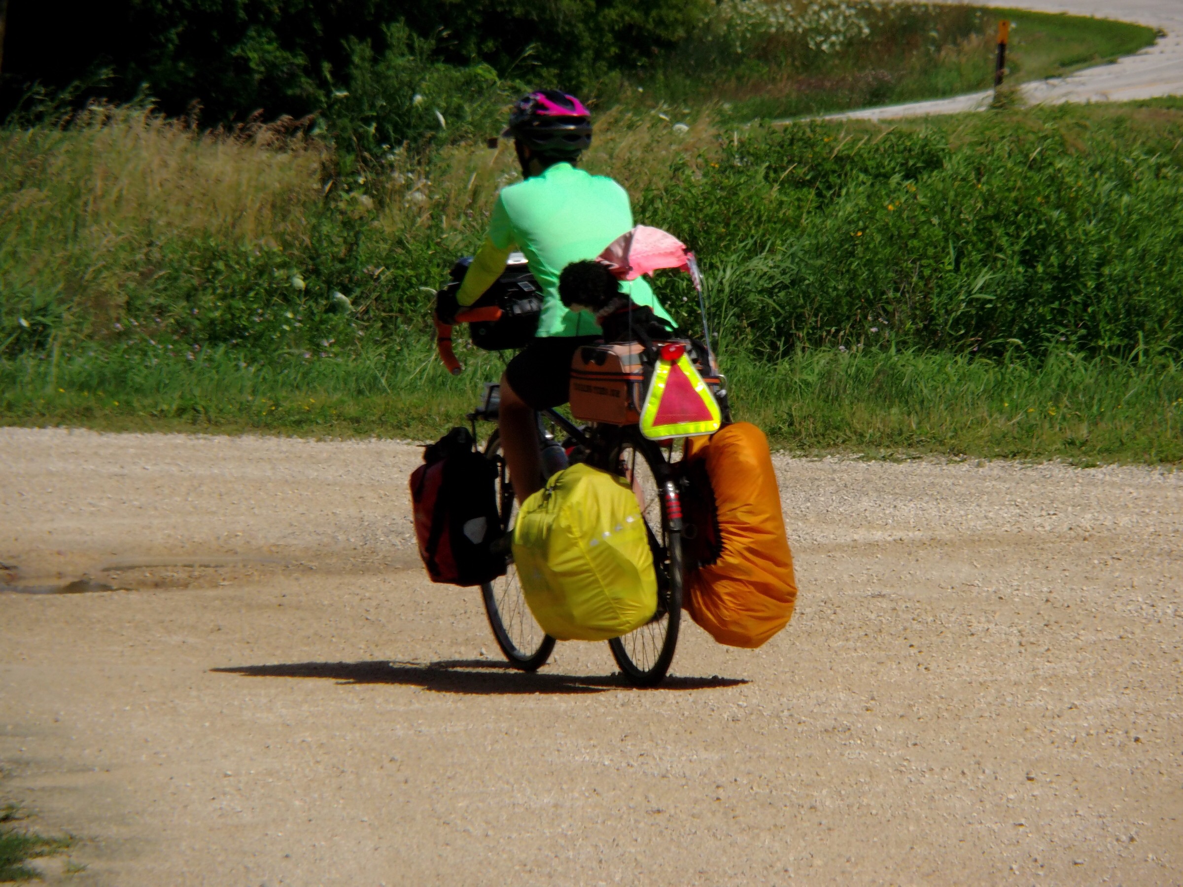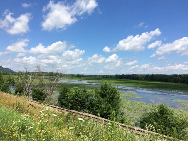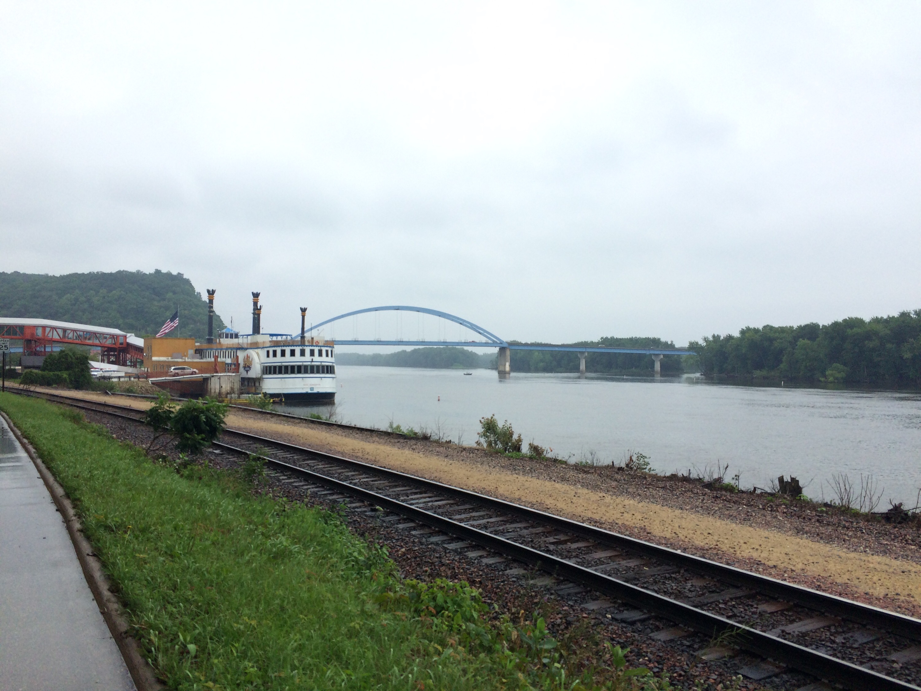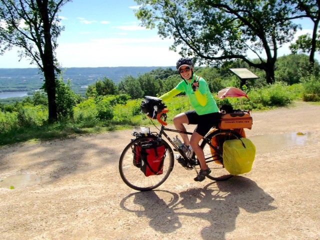In the early afternoon, I’d done 50 miles and reached the bustling city of La Crescent, MN, where I stopped for water at a convnience store called Kwik Trip, where the staff was very friendly and let me fill my bottles with ice and water for free. A man standing outside with shoulder-length white hair chatted with me about my trip for a little while, and I asked him for clarification on the directions for thenext part of my route. My map said I could avoid some steep hills if I followed state route 61, but on my GPS, it seemed like that was an interstate, and I didn’t want to accidentally ride on a highway again like that one scary time in Denver when I mistakenly rode on the freeway for one exit during rush hour. Not fun. There was a cylist-friendly campground ahead on that route, though, so I thought if I could confirm its safety, that might be the best way to go. I went back in the store to see if there was anything I wanted to snack on, but left empty handed. When I left the store, he was on the phone, and approached me again to say that he had his wife on the phone and if I was interested, I could come stay the night with them. I voice-verified with his wife and decided that even though it was still sort of early, it was a hot day and I was sure Petunia would appreciate the rest. My coincidental host led the way on his heavy, blue and chrome motorcycle, just a couple of miles down the road. There was one rollercoaster-looking climb, but it wasn’t that long, and at the top, he said he was quite impressed, as he’d tried to ride it before without any gear and was zigzagging back and forth all over the road, pushing hard to get up it.