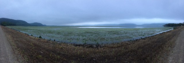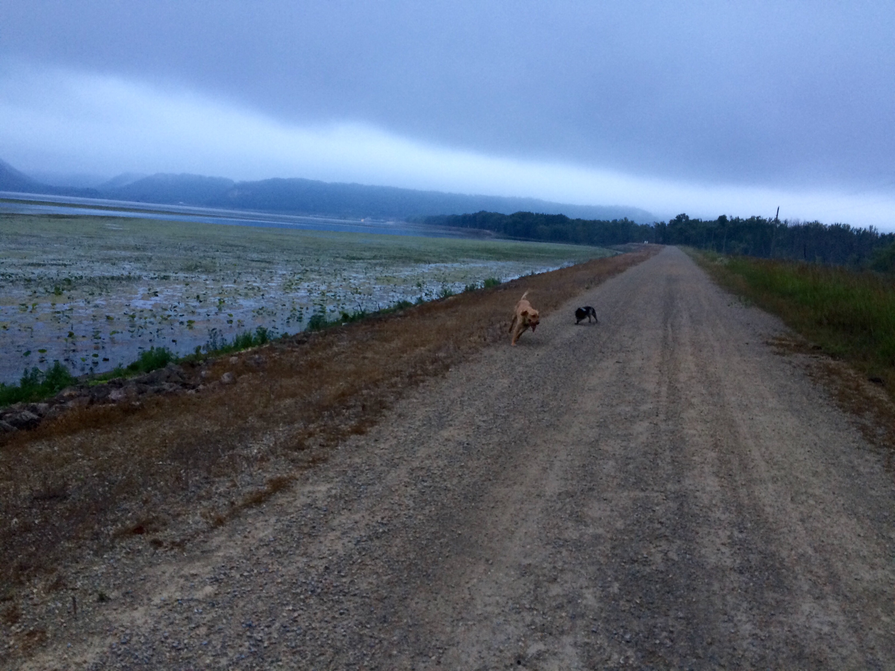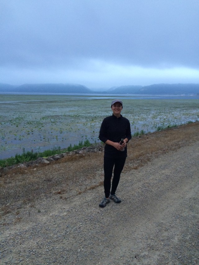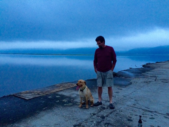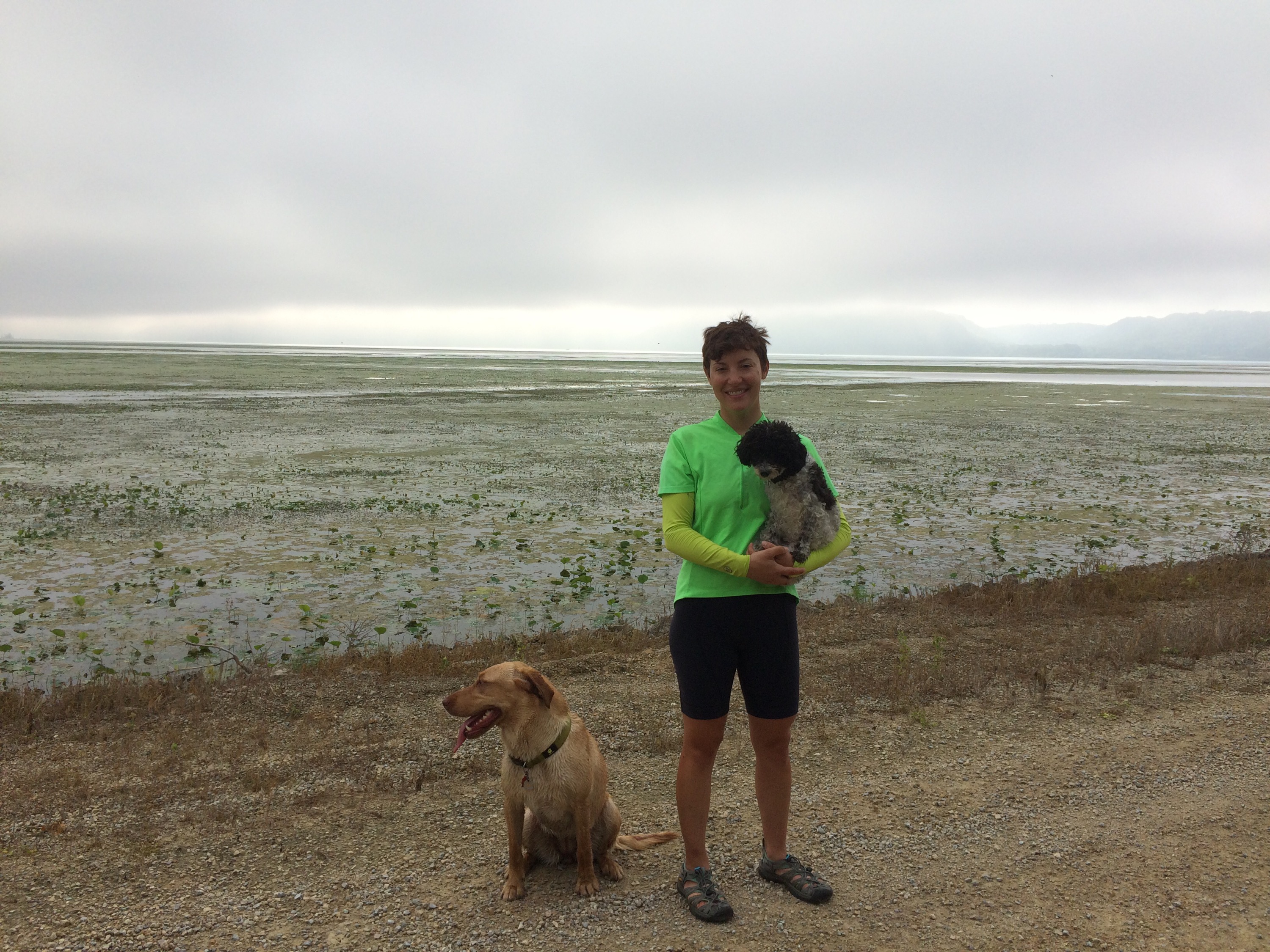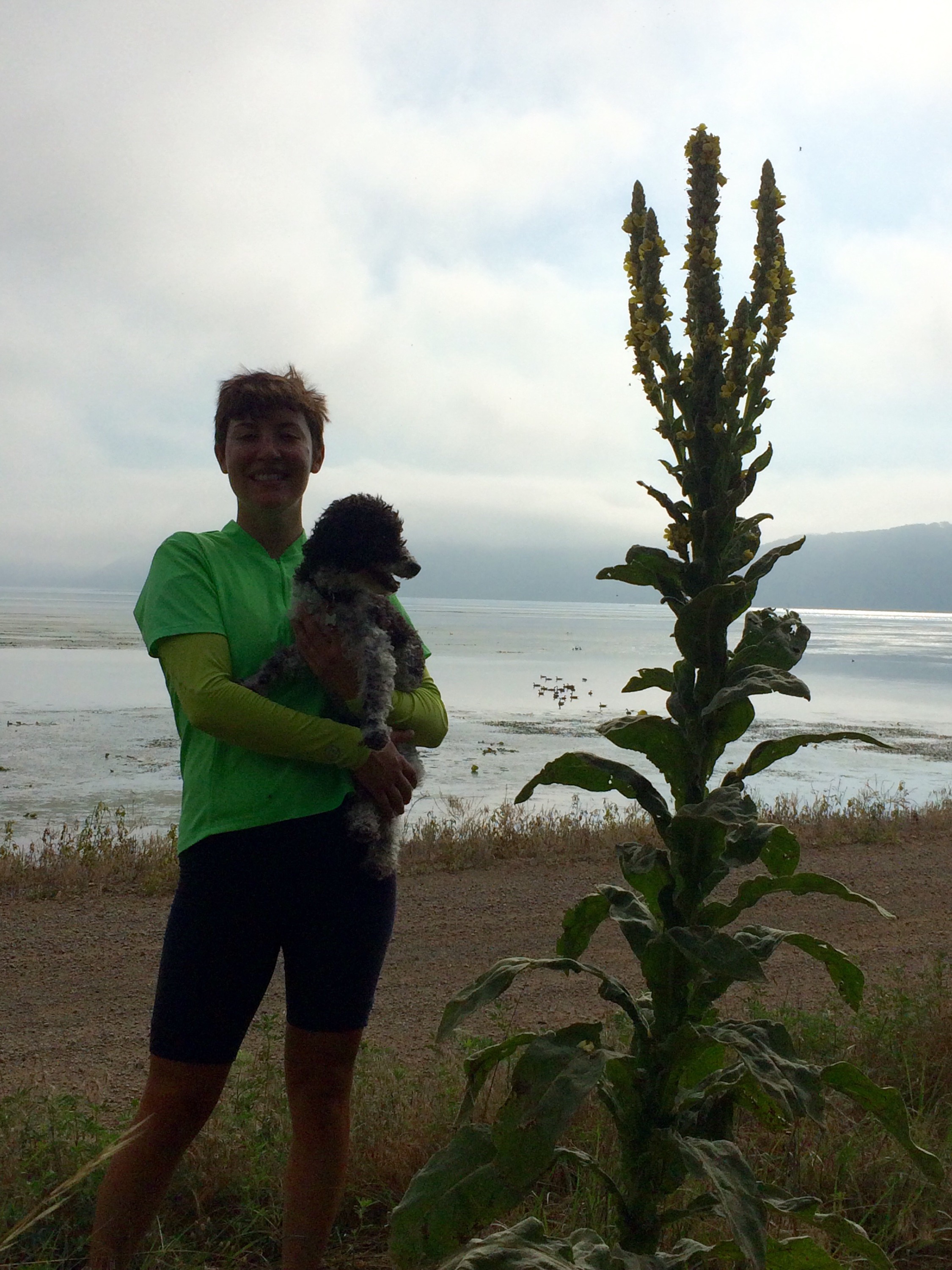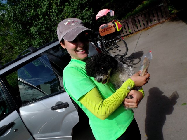 I rode through the small towns in the misty fog, rolling slowly past an assortment of restaurants whose alluring smells nearly made me park and grub, but I pressed on and ate another peanut butter granola bar. During one stretch without any shoulder and two lanes of busy tourist traffic, I felt Petunia’s paw giving me a little poke on my butt, giving her signal for potty time. But there was nowhere to pull off and it would be unsafe to stop right there. I couldn’t see the next turn off ahead, either. “Hold on one minute, little cow,” I soothed her reassuringly, but I heard a low hnnngggg grunt in reply. “I know, but we can’t stop here, sorry.” I quickened my pace to a sprint so I could help her get some relief faster. Hnggg hnnnnnng, she moaned uncomfortably. Then I felt her shift her body to the side of the carrier, then the other, back and forth, swaying the bike a little bit. “I understand, but please don’t throw us into traffic, okay?” A mile or so down the road, there was finally a parking lot with a patch of grass, and she took just three steps and had quite a wee and water break. “Sorry, Tunes. You are such a good dog.” I told her, and threw her squeaky toy around for a short game of fetch.