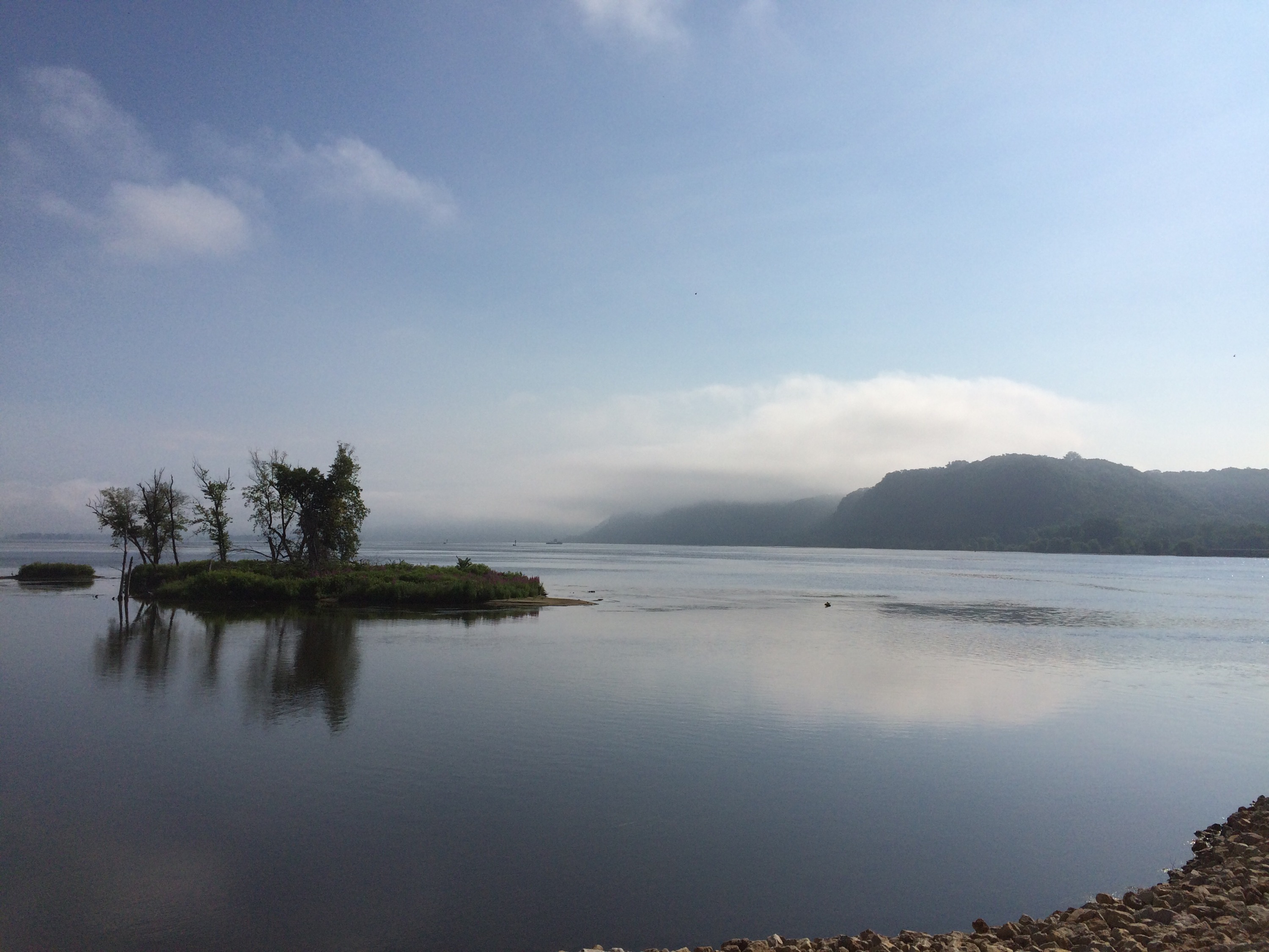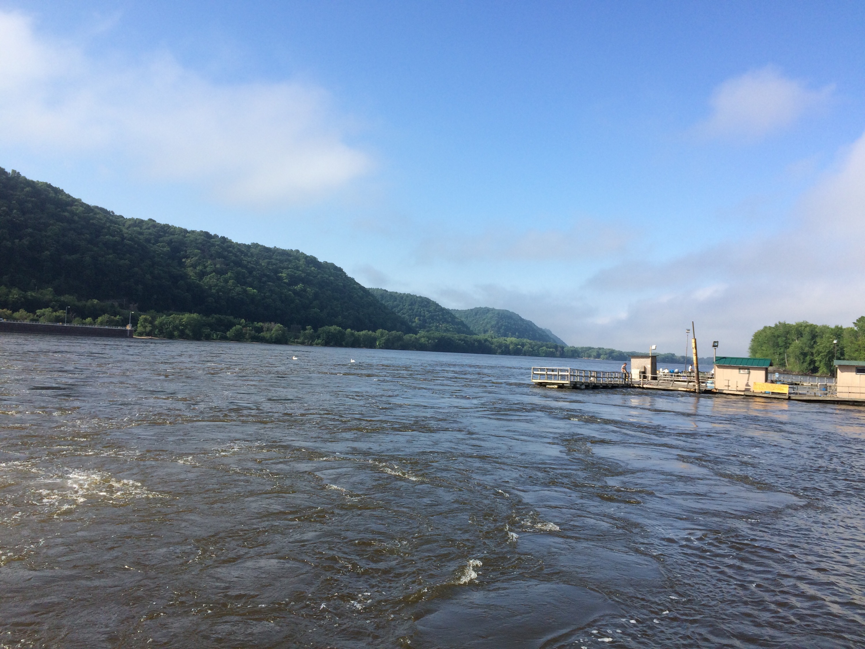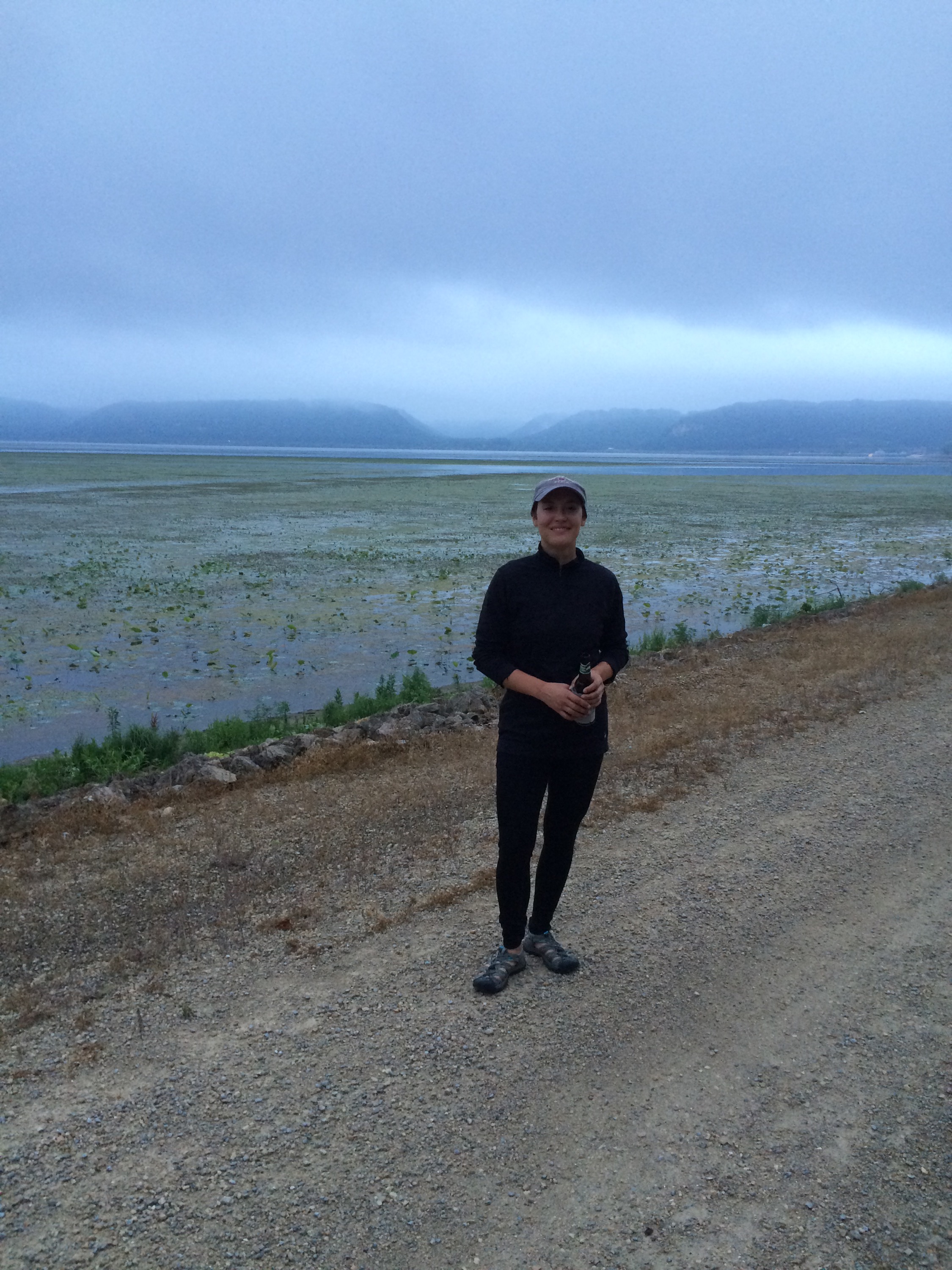 The beauty of this riverside walk mesmerized us, and our talk turned to spiritual matters and the reverence for the peace in natural, quiet places like this. It looked a little like New Zealand or Hawaii or Jackson Hole, and he commented, “You’d never know this was Iowa just looking at it. People are too busy watching TV and don’t even know that this gorgeous place is out here.” We headed back before it got too dark, and he made a crackling campfire that we sat around and talked beside for a while until it was time to sleep, and I rested comfortably, feeling lucky to have been open to this experience and been able to end my day with such a spectacular sight. Before I left the next day, we walked the length of the lock, a 4 mile hike, and Brian pointed out a lot of interesting wildlife– a few bald eagles, ducks, sparrows, a snake that made us jump in surprise, a blue-patched fish caught by a man with an impressive assortment of fishing gear. The morning fog had burned off and it wasgetting quite hot again, so before the day escaped me, I set out again to do some more climbing.