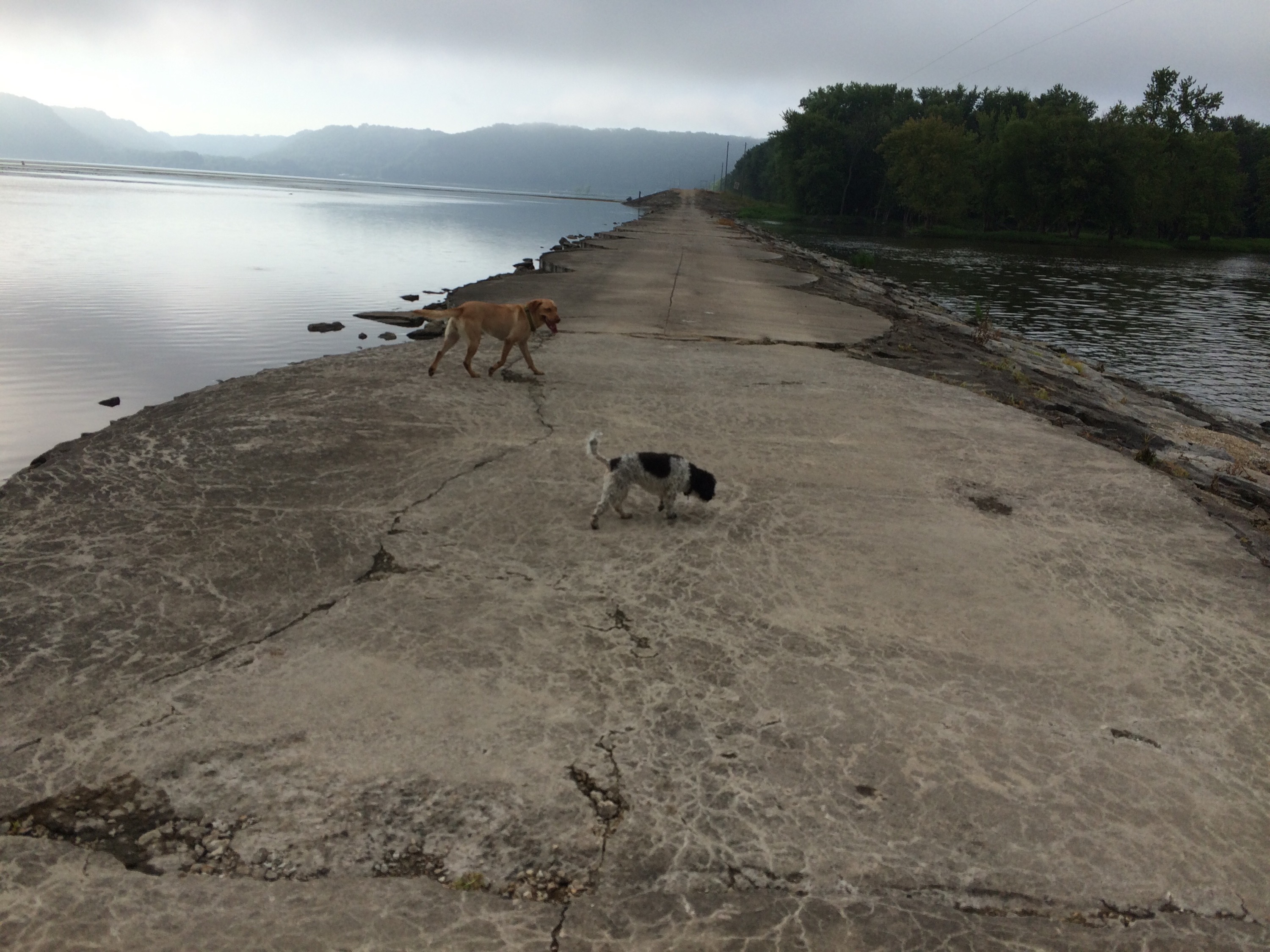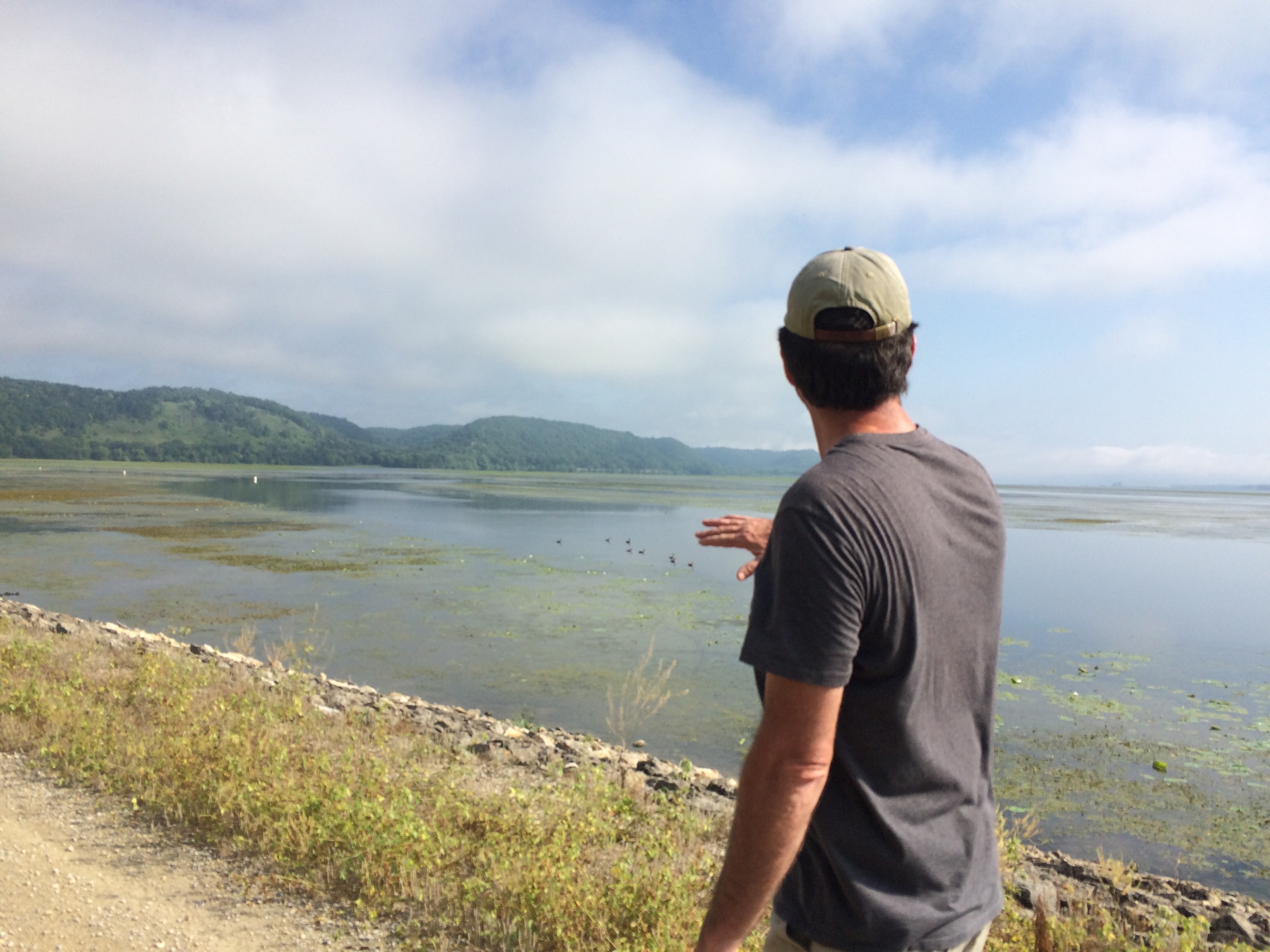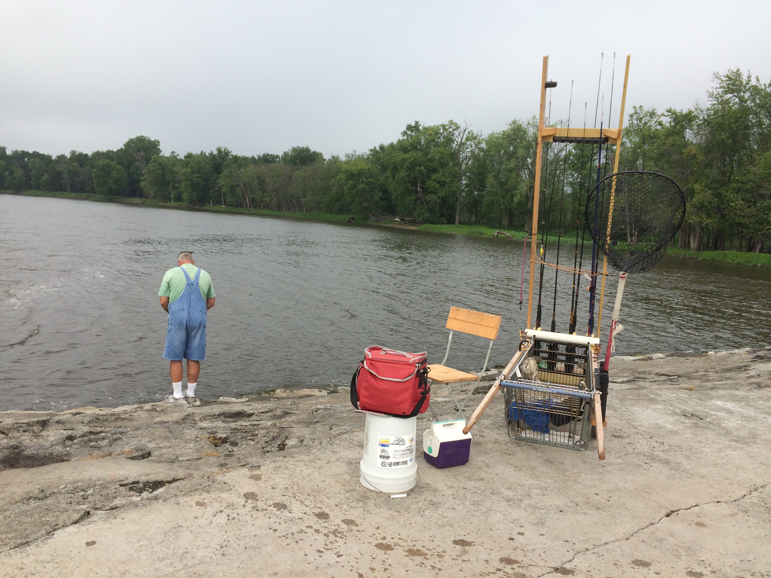 The beauty of this riverside walk mesmerized us, and our talk turned to spiritual matters and the reverence for the peace in natural, quiet places like this. It looked a little like New Zealand or Hawaii or Jackson Hole, and he commented, “You’d never know this was Iowa just looking at it. People are too busy watching TV and don’t even know that this gorgeous place is out here.” We headed back before it got too dark, and he made a crackling campfire that we sat around and talked beside for a while until it was time to sleep, and I rested comfortably, feeling lucky to have been open to this experience and been able to end my day with such a spectacular sight. Before I left the next day, we walked the length of the lock, a 4 mile hike, and Brian pointed out a lot of interesting wildlife– a few bald eagles, ducks, sparrows, a snake that made us jump in surprise, a blue-patched fish caught by a man with an impressive assortment of fishing gear. The morning fog had burned off and it wasgetting quite hot again, so before the day escaped me, I set out again to do some more climbing.
