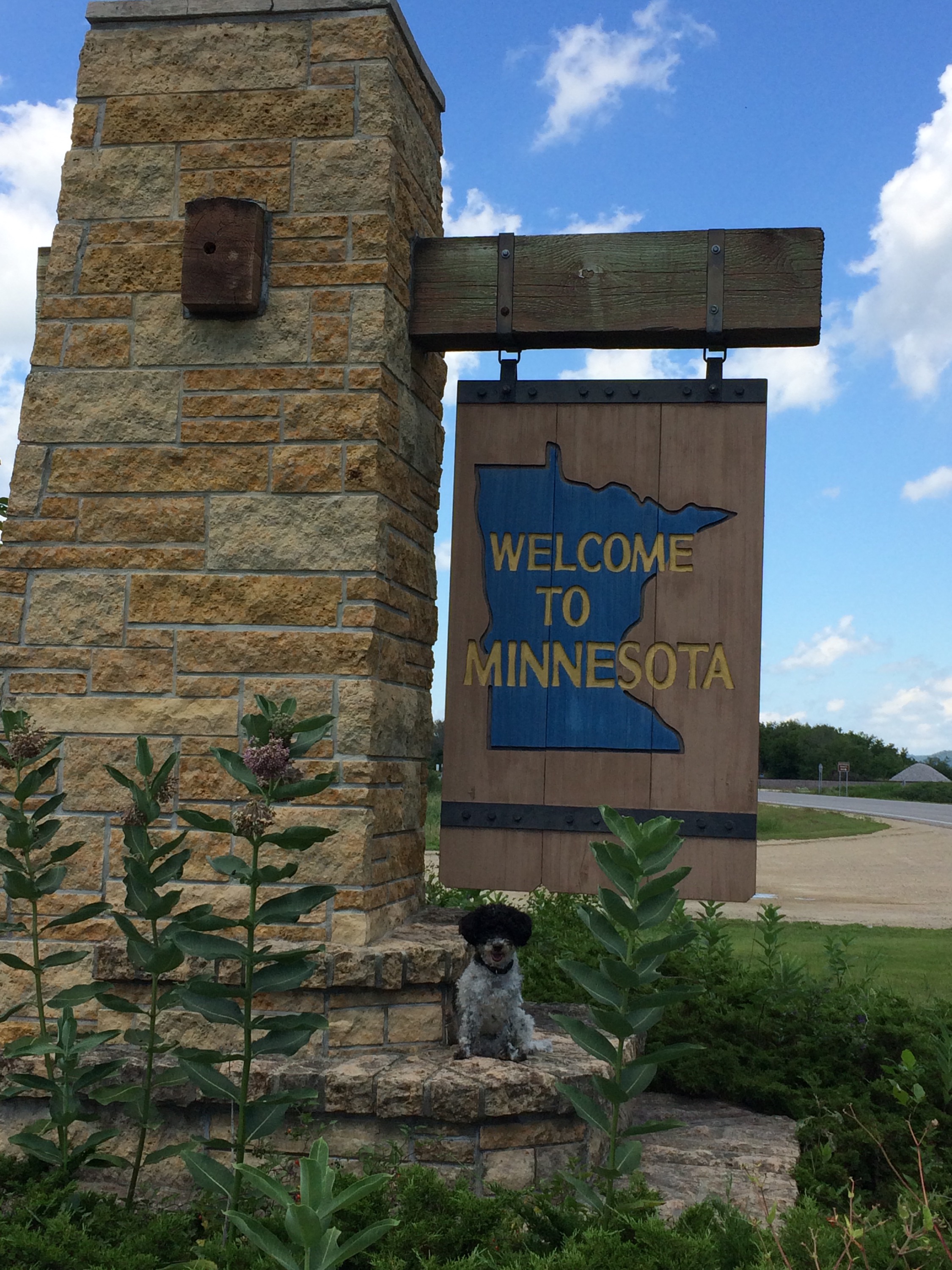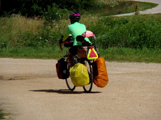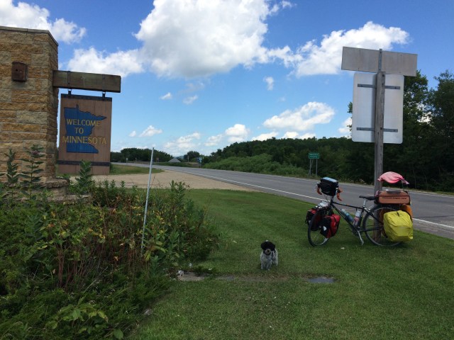 Singing loudly as I cranked up hills, I was in a fantastic mood, amplified by some catchy songs on the radio, including today’s song of the day that I boogied to, weaving waves on the empty streets like a big muppet musical number. Yeah, I’m in love with my life, I agreed with the music, nodding in time. This hasn’t always been the case for me, as darker days in the past made it hard to see all of the joyful possibilities that now seem to stretch out all around me. I made it into Minnesota and took the usual state border pictures, and MN wins the prize for in terms of the nicest sign, all carved and landscaped as a decorative welcome post. I saw some kids having a carwash and was tempted to roll through to have them hose down my rig and myself, and puppy was starting to need a bath again, too. Instead, we just filled up water bottles in a convenience store. An elderly man saw my knee brace and asked how I hurt myself. “Ah, it’s an old skiing injury that gets a little cranky now and again,” and he nodded with a knowing smile. “I used to play baseball, a lot, probably until I was too old, in my 40s, when I just couldn’t go on any longer. Two torn rotator cuffs, both knees shot, yup,” he laughed. “But we make the best of it and still keep going, don’t we?” “Absolutely,” he said with a grandfatherly jolliness. “Good luck to you. Maybe I’ll see you on World of Sports!” “Better there than on the six o’clock news!” I said and we shook hands and parted ways.