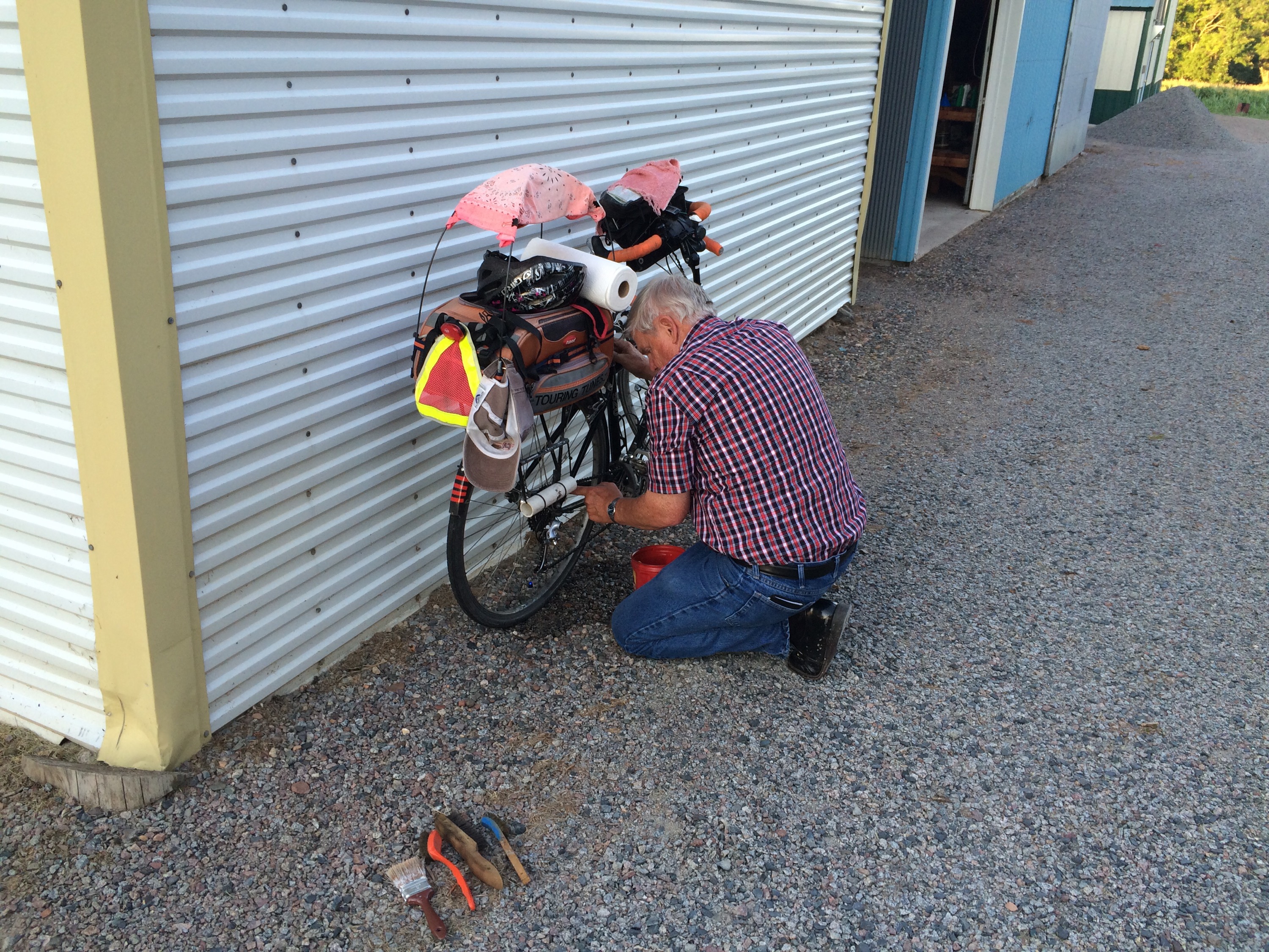 The bustling effervescence of the B&B crew plus the beautiful farm and meticulously landscaped surroundings made for a festive evening. Under the cover of darkness, I wrote the gang a silly chalk note in the margins of the street for their early departure the next day. We wondered if we’d see each other again, but I suspected it might be our last chance encounter. But who knows? Stranger things have happened. The day they left, Don invited me to take a day off there, so I took him up on the offer and did some maintenance, writing, reflecting and relaxing. Don even helped me clean my chain. “Minnesota Nice is real!” I exclaimed to him, and he laughed jovially. I found an old guitar in the attic of the barn and sang my heart out in the hay and then in the empty silo, where the reverb and acoustics were so fabulous, I sounded halfway decent.