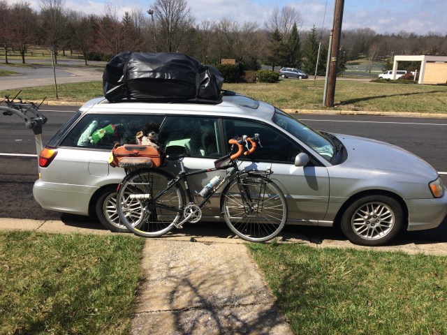 I forged deeper connections that held me happily in Portland for almost a month, but my Rose City relocation dreams were deferred after I ended my tour and returned to New Jersey briefly. Happily, and with thanks to all of the generous supporters of the 2015 fundraiser part of the cross-country trip, we sent a check for $1,277 to GearingUp, and they sent us a very sweet thank-you letter. We’d hoped to get down to Philly to ride with the women in the program and some of the staff, but we were sadly unable to make our schedules match. By late fall, life’s tortuous path led me back to my home state of Connecticut in the fall, where I stayed for a couple of months. The winter there was not brutal, but quite cold, and I spent too much time alternately shut inside or getting windbeaten and weathered on the sub-zero nights I spent stargazing. But during those months, I heard my heart dreaming again and decided it was time to find roots and roads elsewhere. I gave away most of what I owned, fit the essentials (and then some) into a new-to-me ’04 station wagon that I hoped would withstand my plans for it, kissed ma and pa goodbye, and headed south with my best buddy.